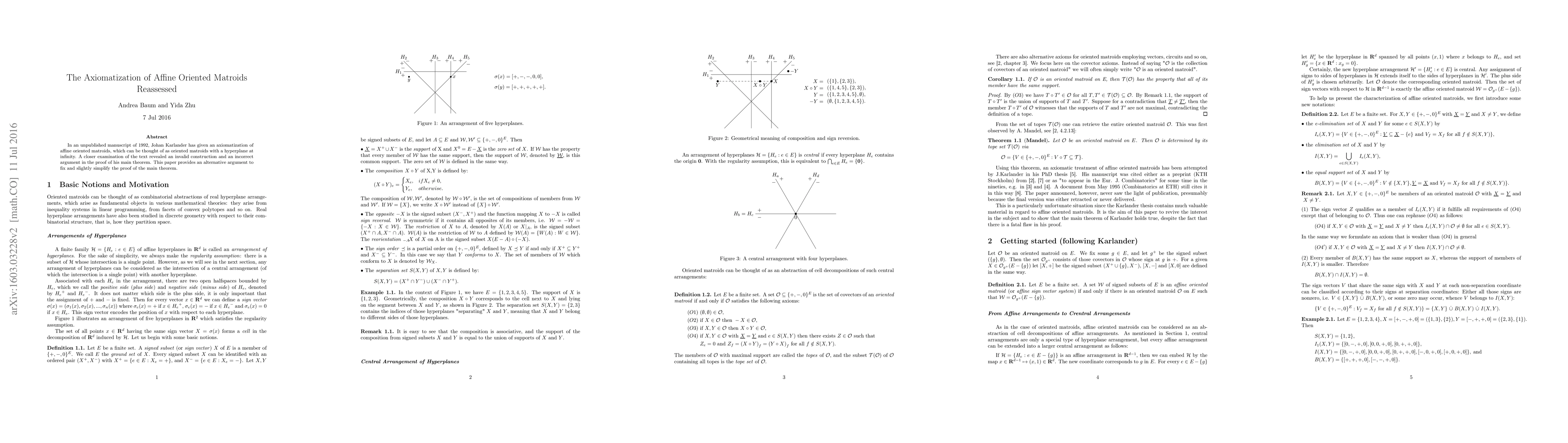 This paper corrects an error in Johan Karlander's 1992 axiomatization of affine oriented matroids and presents an alternative, simplified proof for the main theorem.