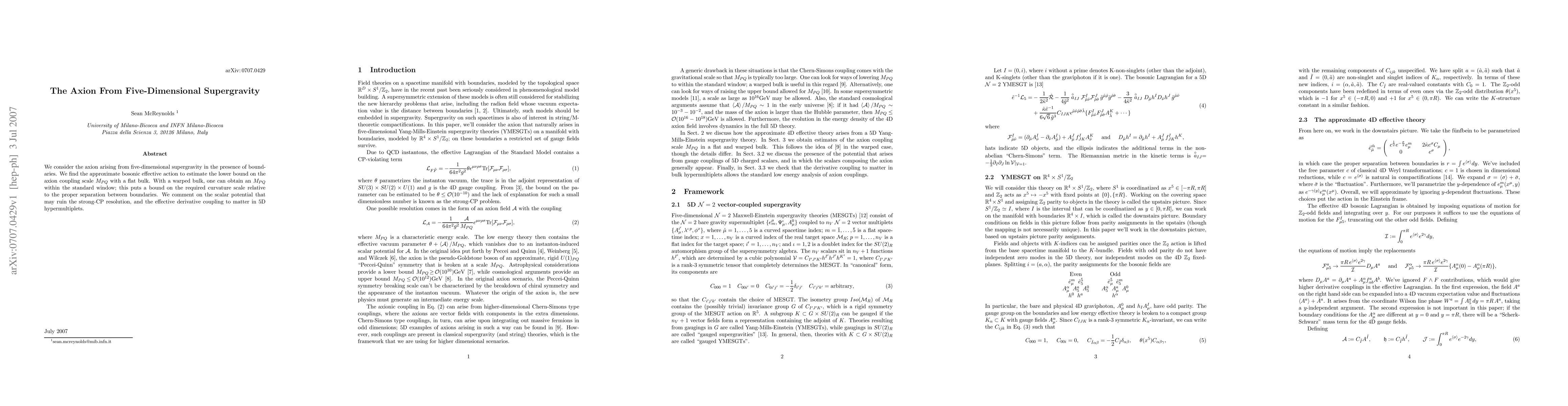 We consider the axion arising from five-dimensional supergravity in the presence of boundaries. We find the approximate bosonic effective action to estimate the lower bound on the "Peccei-Quinn" energy scale with a flat bulk. With a warped bulk, one can obtain a scale within the standard window; this puts a bound on the required curvature scale relative to the proper separation between boundaries. We comment on the scalar potential that may ruin the strong-CP resolution, and the effective derivative coupling to matter in 5D hypermultiplets.