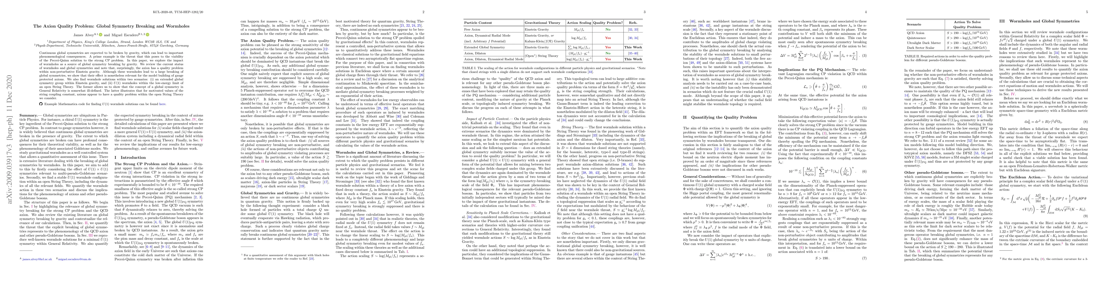 Continuous global symmetries are expected to be broken by gravity, which can lead to important phenomenological consequences. A prime example is the threat that this poses to the viability of the Peccei-Quinn solution to the strong CP problem. In this paper, we explore the impact of wormholes as a source of global symmetry breaking by gravity. We review the current status of wormholes and global symmetries and note that, surprisingly, the axion has a quality problem within non-perturbative Einstein gravity. Although these wormholes lead to a large breaking of global symmetries, we show that their effect is nonetheless relevant for the model building of gauge protected axions. We also find wormhole solutions within two scenarios: (i) an extended global symmetry group within Einstein gravity, and (ii) U(1) wormholes within the low-energy limit of an open String Theory. The former allows us to show that the concept of a global symmetry in General Relativity is somewhat ill-defined. The latter illustrates that for motivated values of the string coupling constant, axions appear to have a quality problem within the open String Theory we consider.