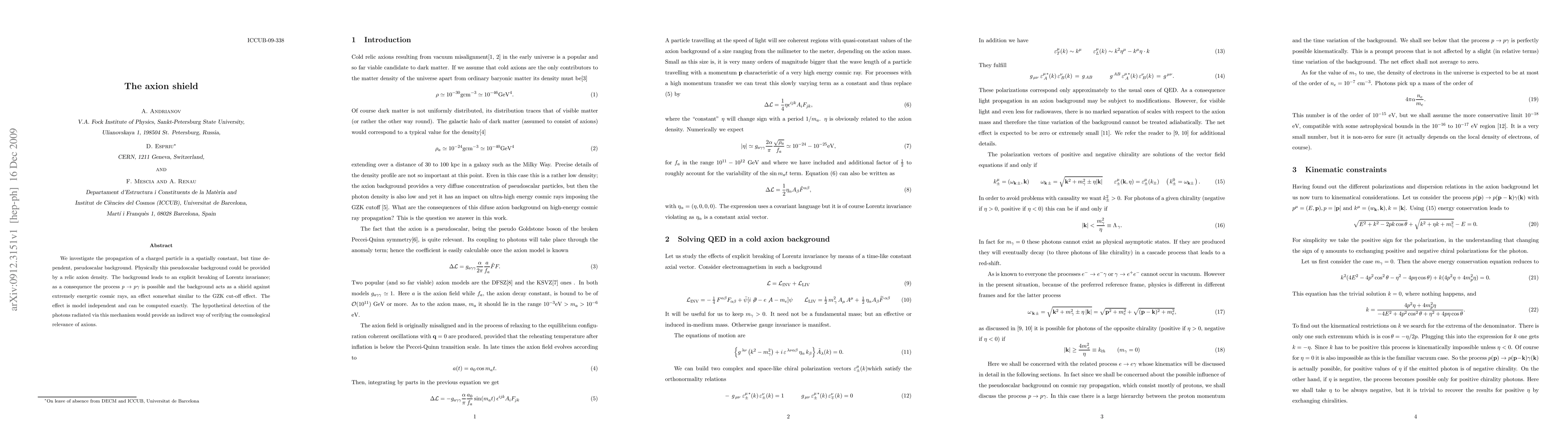 We investigate the propagation of a charged particle in a spatially constant, but time dependent, pseudoscalar background. Physically this pseudoscalar background could be provided by a relic axion density. The background leads to an explicit breaking of Lorentz invariance; as a consequence the process p-> p gamma is possible and the background acts as a shield against extremely energetic cosmic rays, an effect somewhat similar to the GZK cut-off effect. The effect is model independent and can be computed exactly. The hypothetical detection of the photons radiated via this mechanism would provide an indirect way of verifying the cosmological relevance of axions.