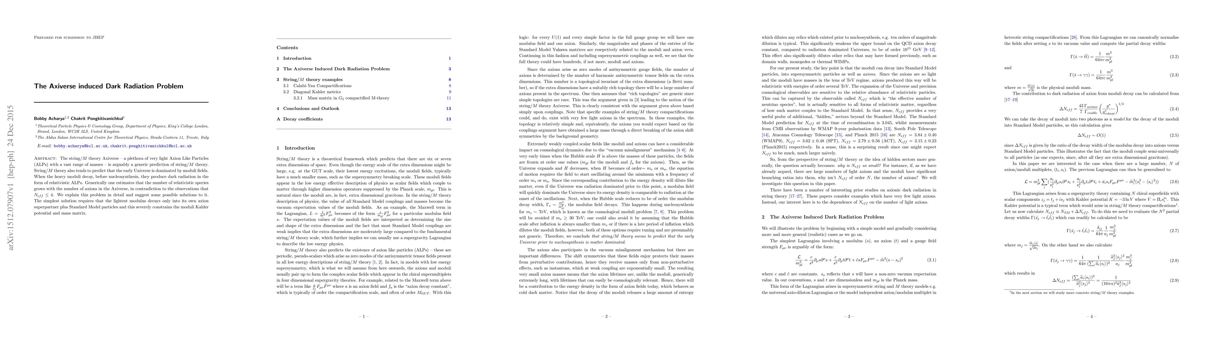 The paper discusses the Dark Radiation Problem arising from the Axiverse in string/$M$ theory, where the decay of moduli fields produces relativistic Axion Like Particles (ALPs) in contradiction to observed effective relativistic species. A potential solution involves restricting the lightest modulus decay to its axion superpartner and Standard Model particles, thus constraining the moduli Kahler potential and mass matrix.