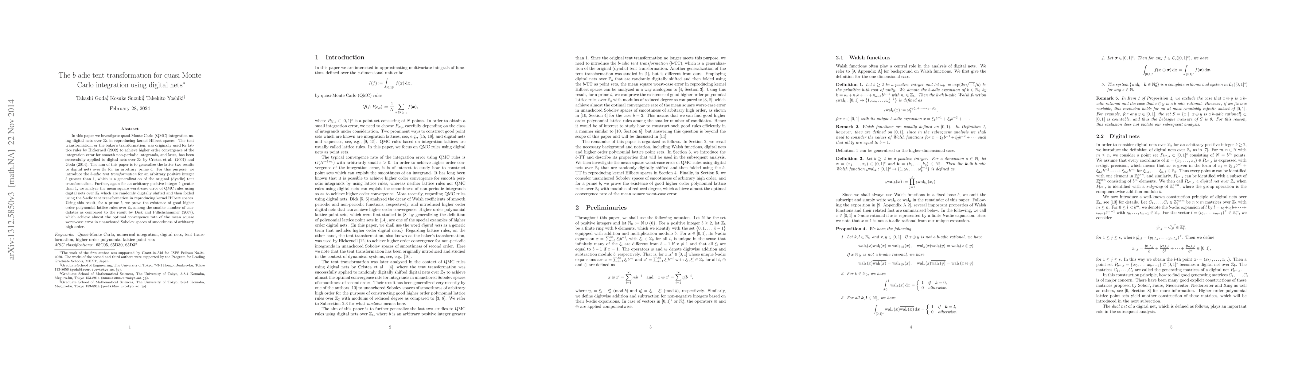 In this paper we investigate quasi-Monte Carlo (QMC) integration using digital nets over $\mathbb{Z}_b$ in reproducing kernel Hilbert spaces. The tent transformation, or the baker's transformation, was originally used for lattice rules by Hickernell (2002) to achieve higher order convergence of the integration error for smooth non-periodic integrands, and later, has been successfully applied to digital nets over $\mathbb{Z}_2$ by Cristea et al. (2007) and Goda (2014). The aim of this paper is to generalize the latter two results to digital nets over $\mathbb{Z}_b$ for an arbitrary prime $b$. For this purpose, we introduce the {\em $b$-adic tent transformation} for an arbitrary positive integer $b$ greater than 1, which is a generalization of the original (dyadic) tent transformation. Further, again for an arbitrary positive integer $b$ greater than 1, we analyze the mean square worst-case error of QMC rules using digital nets over $\mathbb{Z}_b$ which are randomly digitally shifted and then folded using the $b$-adic tent transformation in reproducing kernel Hilbert spaces. Using this result, for a prime $b$, we prove the existence of good higher order polynomial lattice rules over $\mathbb{Z}_b$ among the smaller number of candidates as compared to the result by Dick and Pillichshammer (2007), which achieve almost the optimal convergence rate of the mean square worst-case error in unanchored Sobolev spaces of smoothness of arbitrary high order.