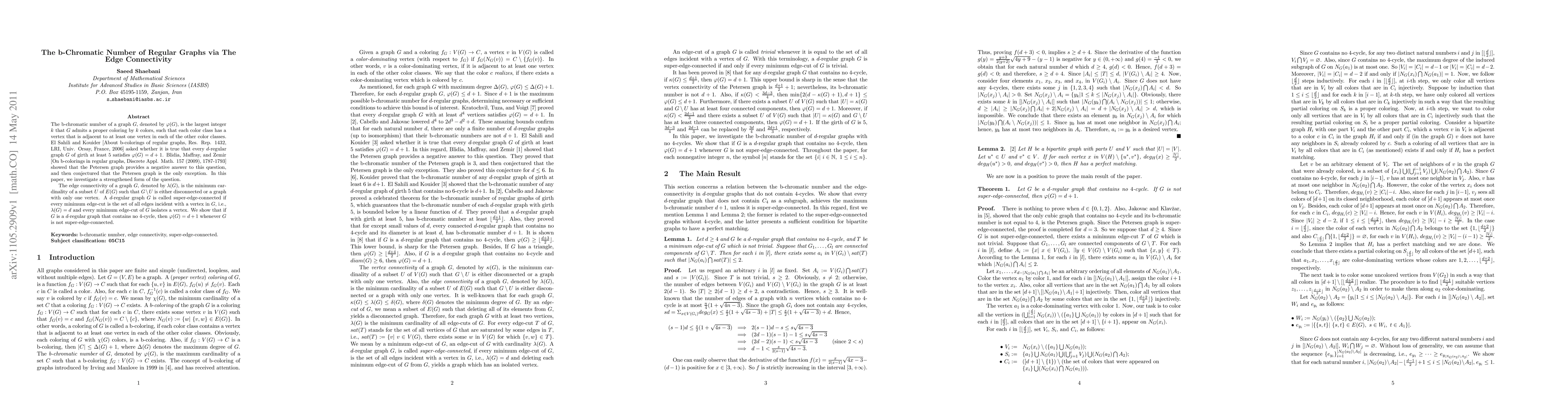 \noindent The b-chromatic number of a graph $G$, denoted by $\phi(G)$, is the largest integer $k$ that $G$ admits a proper coloring by $k$ colors, such that each color class has a vertex that is adjacent to at least one vertex in each of the other color classes. El Sahili and Kouider [About b-colorings of regular graphs, Res. Rep. 1432, LRI, Univ. Orsay, France, 2006] asked whether it is true that every $d$-regular graph $G$ of girth at least 5 satisfies $\phi(G)=d+1$. Blidia, Maffray, and Zemir [On b-colorings in regular graphs, Discrete Appl. Math. 157 (2009), 1787-1793] showed that the Petersen graph provides a negative answer to this question, and then conjectured that the Petersen graph is the only exception. In this paper, we investigate a strengthened form of the question. The edge connectivity of a graph $G$, denoted by $\lambda(G)$, is the minimum cardinality of a subset $U$ of $E(G)$ such that $G\setminus U$ is either disconnected or a graph with only one vertex. A $d$-regular graph $G$ is called super-edge-connected if every minimum edge-cut is the set of all edges incident with a vertex in $G$, i.e., $\lambda(G)=d$ and every minimum edge-cut of $G$ isolates a vertex. We show that if $G$ is a $d$-regular graph that contains no 4-cycle, then $\phi(G)=d+1$ whenever $G$ is not super-edge-connected.