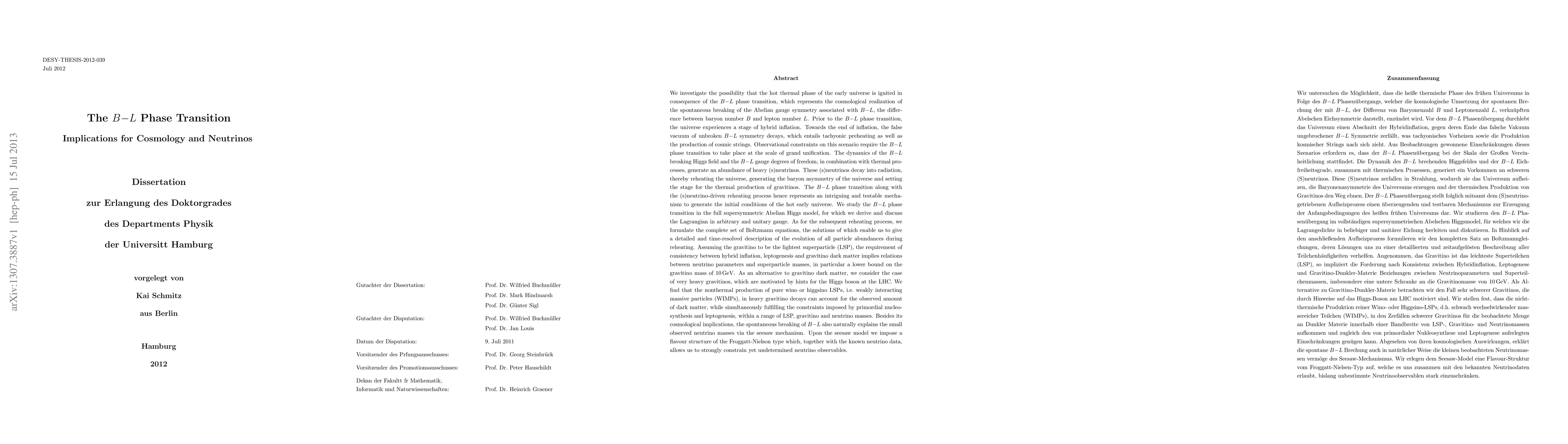 We investigate the possibility that the hot thermal phase of the early universe is ignited in consequence of the B-L phase transition, which represents the cosmological realization of the spontaneous breaking of the Abelian gauge symmetry associated with B-L, the difference between baryon number B and lepton number L. Prior to the B-L phase transition, the universe experiences a stage of hybrid inflation. Towards the end of inflation, the false vacuum of unbroken B-L decays, which entails tachyonic preheating as well as the production of cosmic strings. The dynamics of the B-L breaking Higgs field and the B-L gauge degrees of freedom, in combination with thermal processes, generate an abundance of heavy (s)neutrinos. These (s)neutrinos decay into radiation, thereby reheating the universe, generating the baryon asymmetry of the universe and setting the stage for the thermal production of gravitinos. We study the B-L phase transition in the full supersymmetric Abelian Higgs model, for which we derive and discuss the Lagrangian in arbitrary and unitary gauge. As for the subsequent reheating process, we formulate the complete set of Boltzmann equations, the solutions of which enable us to give a detailed and time-resolved description of reheating. Assuming the gravitino to be the lightest superparticle (LSP), the requirement of consistency between hybrid inflation, leptogenesis and gravitino dark matter implies relations between neutrino and superparticle masses, in particular a lower bound on the gravitino mass of 10 GeV. Similarly, in the case of very heavy gravitinos, the nonthermal production of pure wino or higgsino LSPs in heavy gravitino decays can account for the observed amount of dark matter, while simultaneously fulfilling the constraints imposed by primordial nucleosynthesis and leptogenesis.