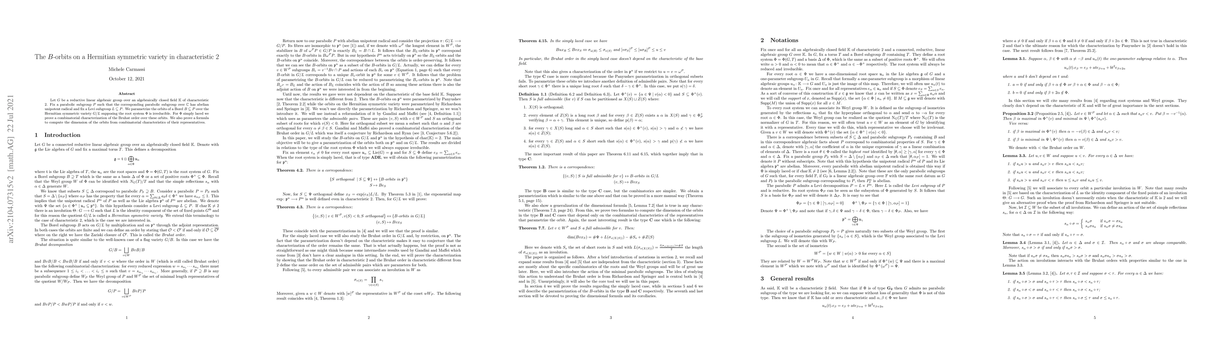 This paper explores B-orbits on Hermitian symmetric varieties in characteristic 2, focusing on the Bruhat order and orbit dimensions. It provides a combinatorial characterization for simply laced root systems and a formula for orbit dimension computation.