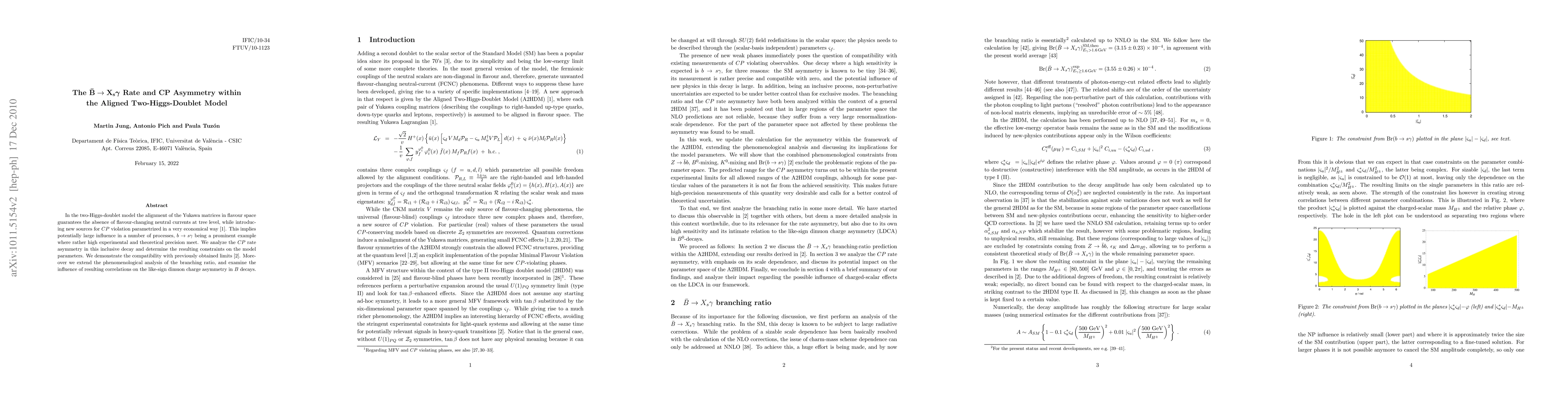 In the two-Higgs-doublet model the alignment of the Yukawa matrices in flavour space guarantees the absence of flavour-changing neutral currents at tree level, while introducing new sources for CP violation parametrized in a very economical way. This implies potentially large influence in a number of processes, b -> s gamma being a prominent example where rather high experimental and theoretical precision meet. We analyze the CP rate asymmetry in this inclusive decay and determine the resulting constraints on the model parameters. We demonstrate the compatibility with previously obtained limits. Moreover we extend the phenomenological analysis of the branching ratio, and examine the influence of resulting correlations on the like-sign dimuon charge asymmetry in B decays.