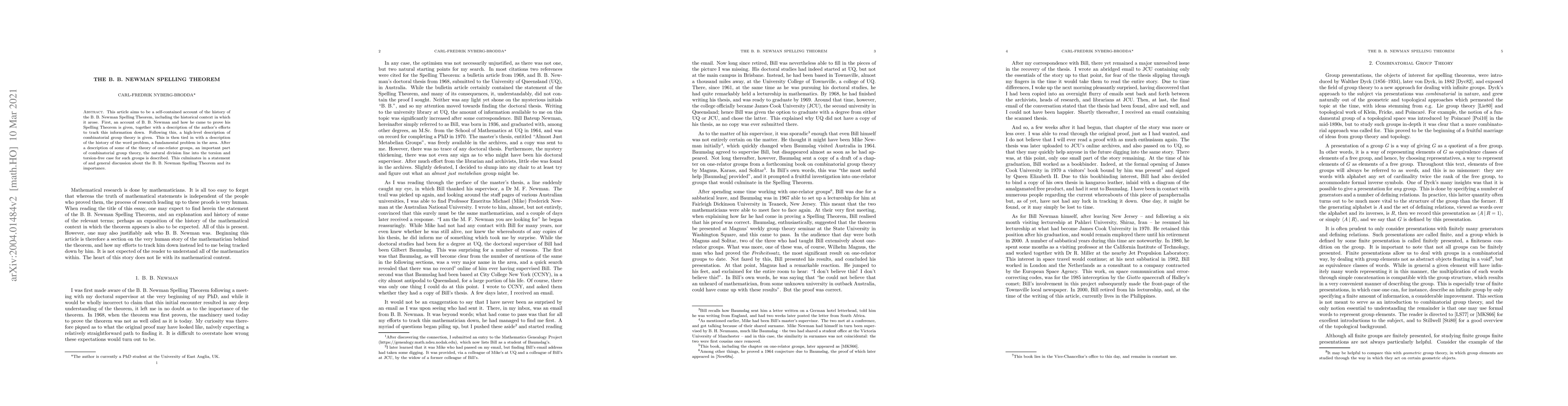 This article aims to be a self-contained account of the history of the B. B. Newman Spelling Theorem, including the historical context in which it arose. First, an account of B. B. Newman and how he came to prove his Spelling Theorem is given, together with a description of the author's efforts to track this information down. Following this, a high-level description of combinatorial group theory is given. This is then tied in with a description of the history of the word problem, a fundamental problem in the area. After a description of some of the theory of one-relator groups, an important part of combinatorial group theory, the natural division line into the torsion and torsion-free case for such groups is described. This culminates in a statement of and general discussion about the B. B. Newman Spelling Theorem and its importance.