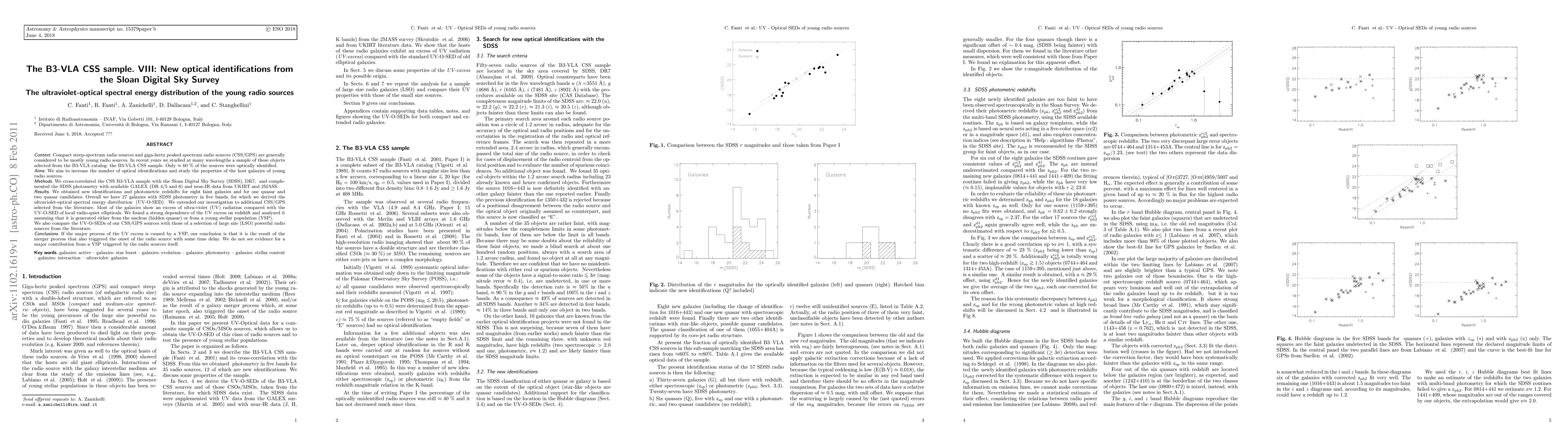 This study increases optical identifications of young radio sources from the B3-VLA CSS sample using Sloan Digital Sky Survey (SDSS), GALEX, and near-IR data. It finds most galaxies show excess UV radiation, likely from a young stellar population or hidden quasar, suggesting mergers trigger both star formation and radio activity with a time delay.