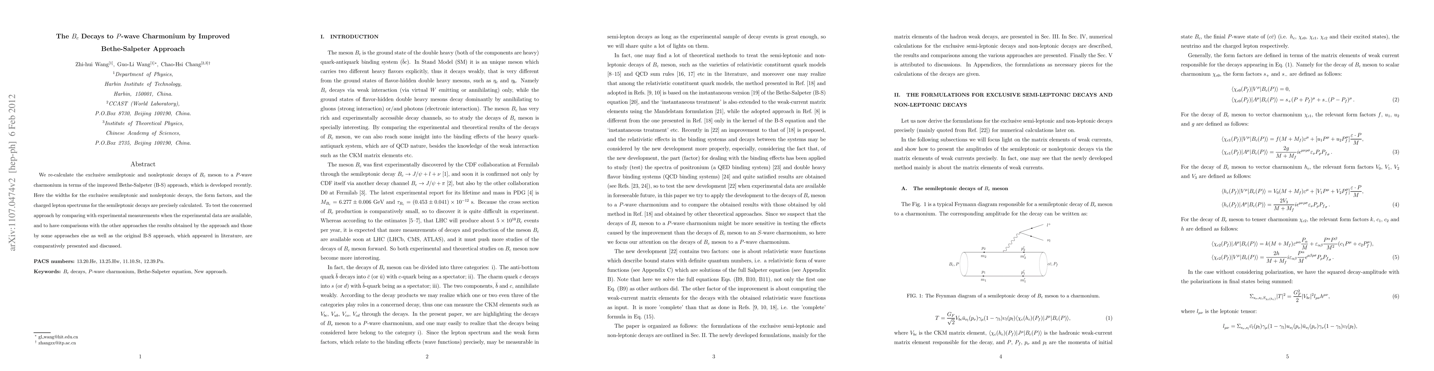 We re-calculate the exclusive semileptonic and nonleptonic decays of $B_c$ meson to a $P$-wave charmonium in terms of the improved Bethe-Salpeter (B-S) approach, which is developed recently. Here the widths for the exclusive semileptonic and nonleptonic decays, the form factors, and the charged lepton spectrums for the semileptonic decays are precisely calculated. To test the concerned approach by comparing with experimental measurements when the experimental data are available, and to have comparisons with the other approaches the results obtained by the approach and those by some approaches else as well as the original B-S approach, which appeared in literature, are comparatively presented and discussed.