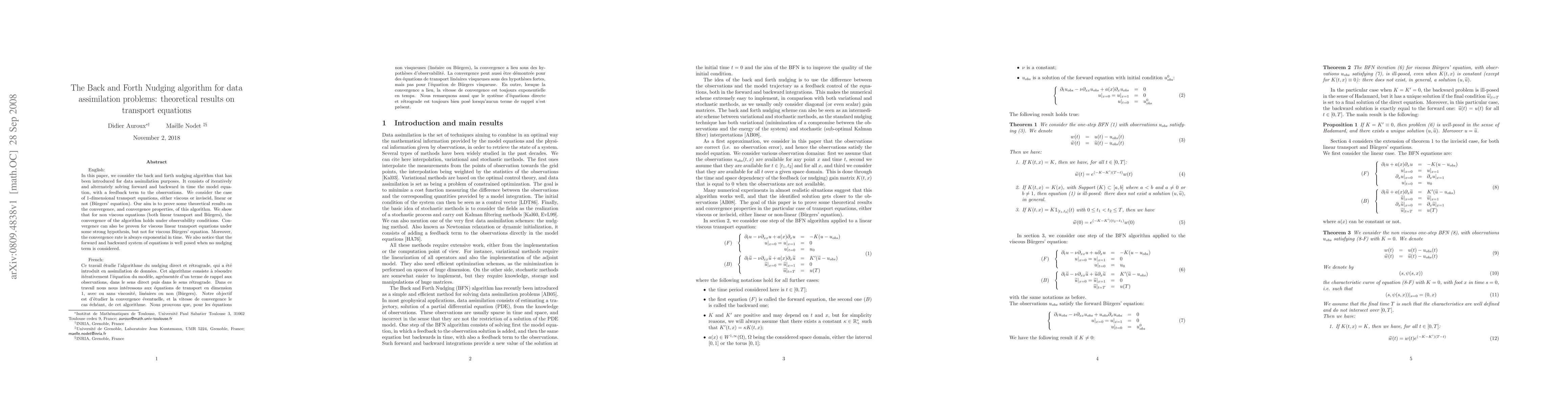 This paper explores the back and forth nudging algorithm for data assimilation in 1-dimensional transport equations, proving convergence under observability conditions for non-viscous equations and under strong hypotheses for viscous linear transport equations, while highlighting an exponential convergence rate.