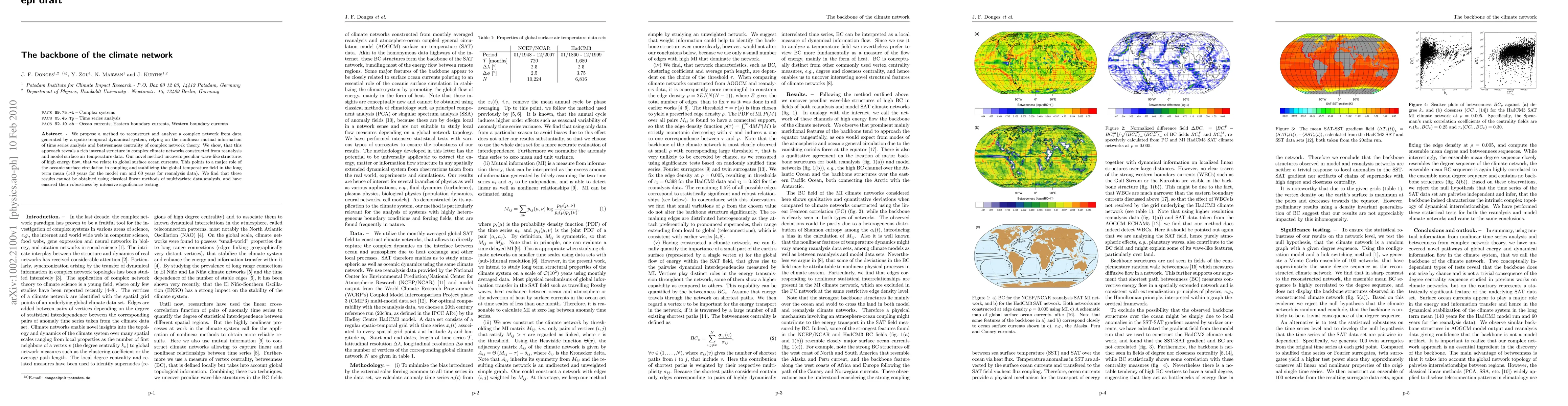We propose a method to reconstruct and analyze a complex network from data generated by a spatio-temporal dynamical system, relying on the nonlinear mutual information of time series analysis and betweenness centrality of complex network theory. We show, that this approach reveals a rich internal structure in complex climate networks constructed from reanalysis and model surface air temperature data. Our novel method uncovers peculiar wave-like structures of high energy flow, that we relate to global surface ocean currents. This points to a major role of the oceanic surface circulation in coupling and stabilizing the global temperature field in the long term mean (140 years for the model run and 60 years for reanalysis data). We find that these results cannot be obtained using classical linear methods of multivariate data analysis, and have ensured their robustness by intensive significance testing.