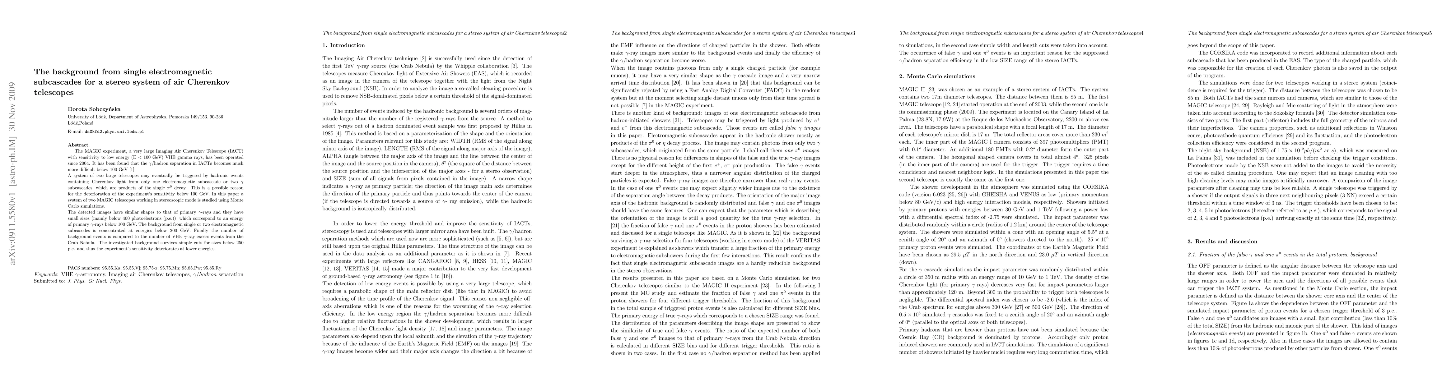 This paper investigates the background from single electromagnetic subcascades in a stereo system of MAGIC telescopes, finding that such backgrounds, originating from hadronic events or single pi^0 decays, significantly impact the experiment's sensitivity to VHE gamma rays below 100 GeV. The study concludes that the background persists even with size cuts, thus degrading the detection capability at lower energies.
