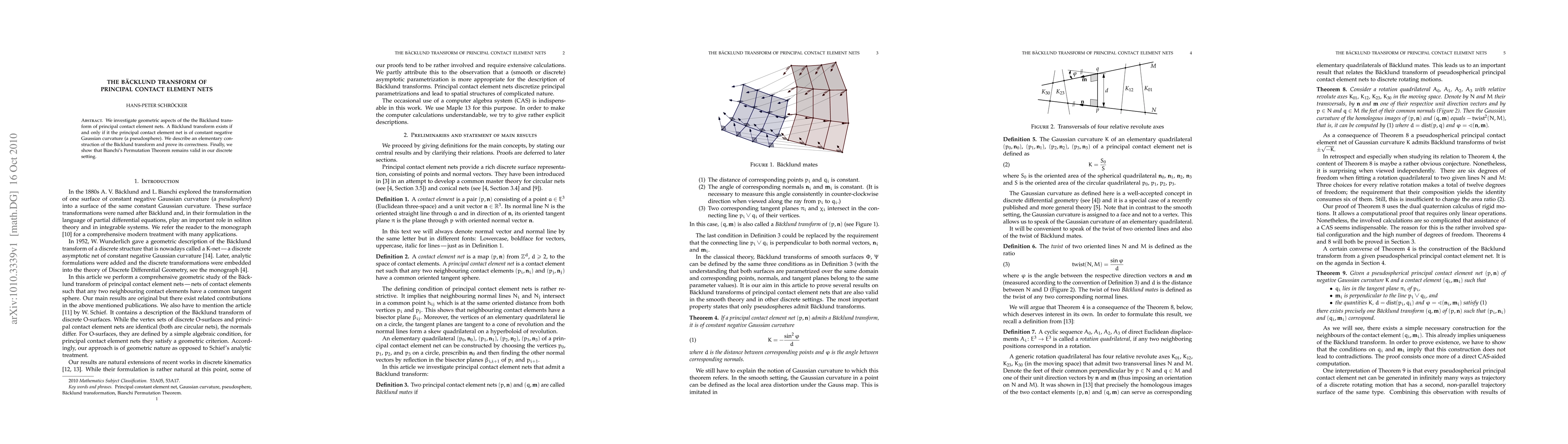 We investigate geometric aspects of the the B\"acklund transform of principal contact element nets. A B\"acklund transform exists if and only if it the principal contact element net is of constant negative Gaussian curvature (a pseudosphere). We describe an elementary construction of the B\"acklund transform and prove its correctness. Finally, we show that Bianchi's Permutation Theorem remains valid in our discrete setting.