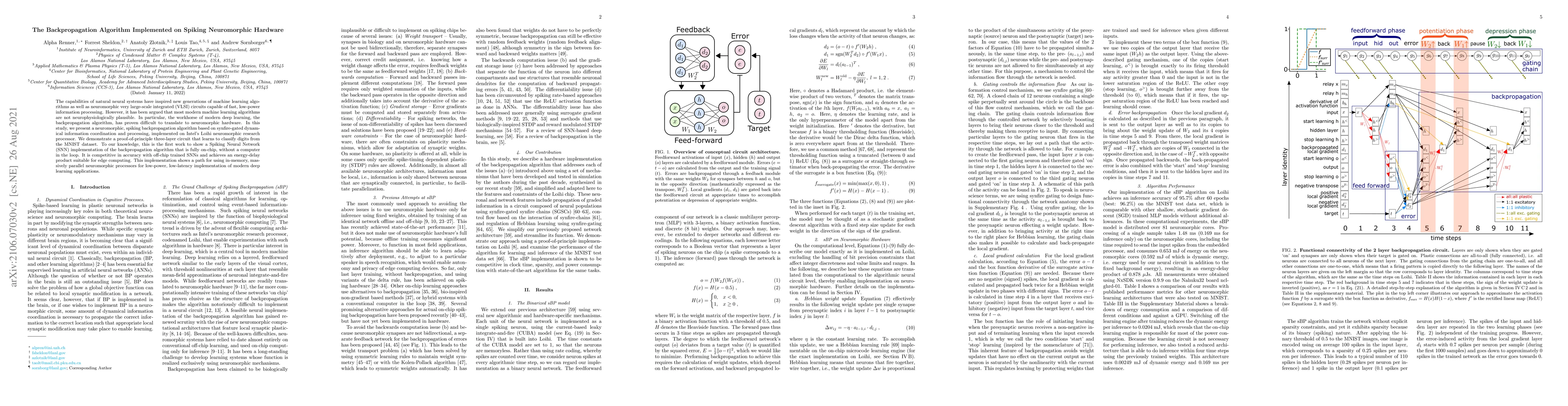 This paper presents a neuromorphic, spiking backpropagation algorithm implemented on Intel's Loihi processor, demonstrating a three-layer circuit that classifies MNIST digits. It shows competitive accuracy and energy-delay product, indicating a viable path for low-power, low-latency deep learning on edge devices.