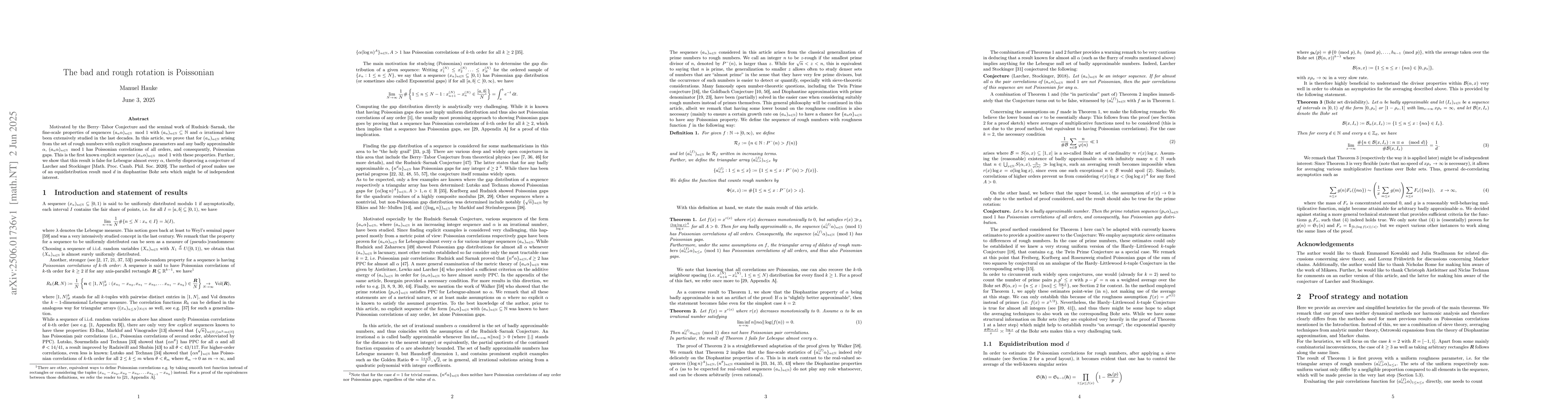 Motivated by the Berry-Tabor Conjecture and the seminal work of Rudnick-Sarnak, the fine-scale properties of sequences $(a_n\alpha)_{n \in \mathbb{N}} \mod 1$ with $(a_n)_{n \in \mathbb{N}} \subseteq \mathbb{N} $ and $\alpha$ irrational have been extensively studied in the last decades. In this article, we prove that for $(a_n)_{n \in \mathbb{N}}$ arising from the set of rough numbers with explicit roughness parameters and any badly approximable $\alpha$, $(a_n\alpha)_{n \in \mathbb{N}} \mod 1$ has Poissonian correlations of all orders, and consequently, Poissonian gaps. This is the first known explicit sequence $(a_n\alpha)_{n \in \mathbb{N}} \mod 1$ with these properties. Further, we show that this result is false for Lebesgue almost every $\alpha$, thereby disproving a conjecture of Larcher and Stockinger [Math. Proc. Camb. Phil. Soc. 2020]. The method of proof makes use of an equidistribution result mod $d$ in diophantine Bohr sets which might be of independent interest.