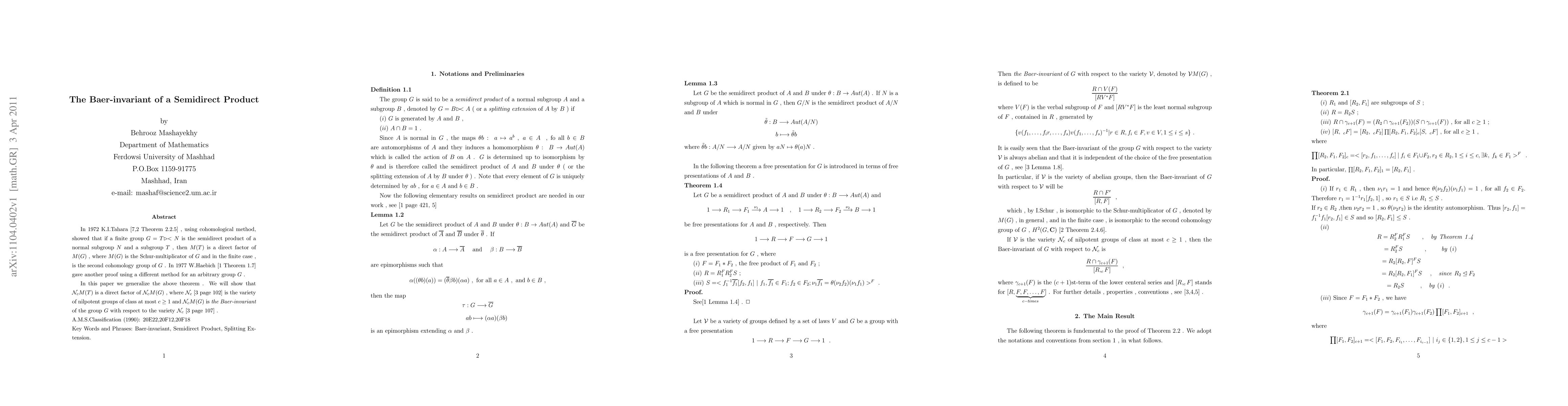 This paper generalizes a 1972 theorem on semidirect products, showing that the Baer-invariant of a group is a direct factor of its Schur-multiplicator for groups in a specific variety of nilpotent groups.
