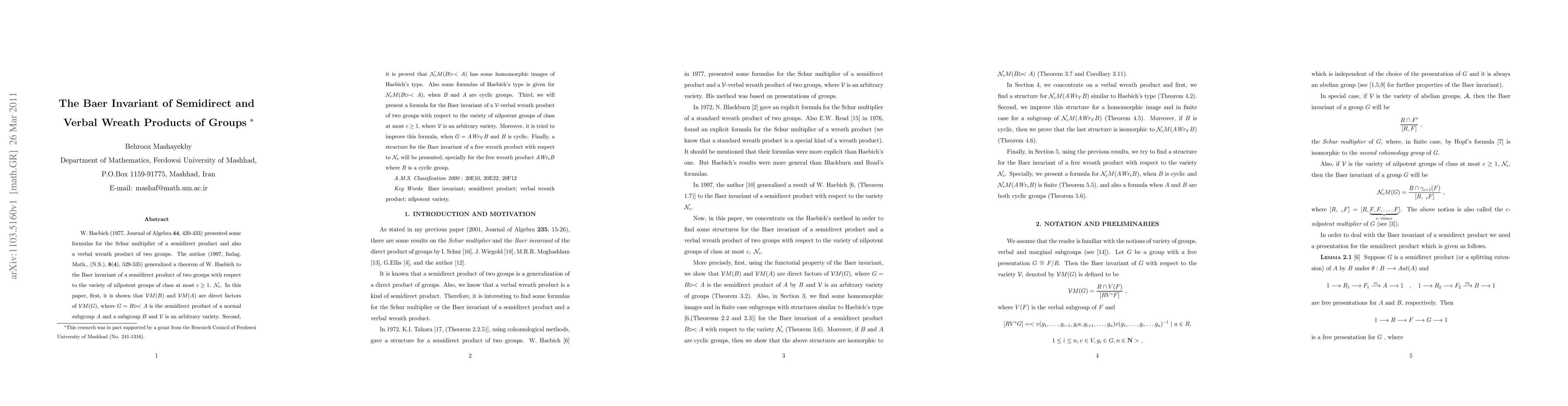 W. Haebich (1977, Journal of Algebra {\bf 44}, 420-433) presented some formulas for the Schur multiplier of a semidirect product and also a verbal wreath product of two groups. The author (1997, Indag. Math., (N.S.), {\bf 8}({\bf 4}), 529-535) generalized a theorem of W. Haebich to the Baer invariant of a semidirect product of two groups with respect to the variety of nilpotent groups of class at most $c\geq 1,\ {\cal N}_c$. In this paper, first, it is shown that ${\cal V}M(B)$ and ${\cal V}M(A)$ are direct factors of ${\cal V}M(G)$, where $G=B\rhd