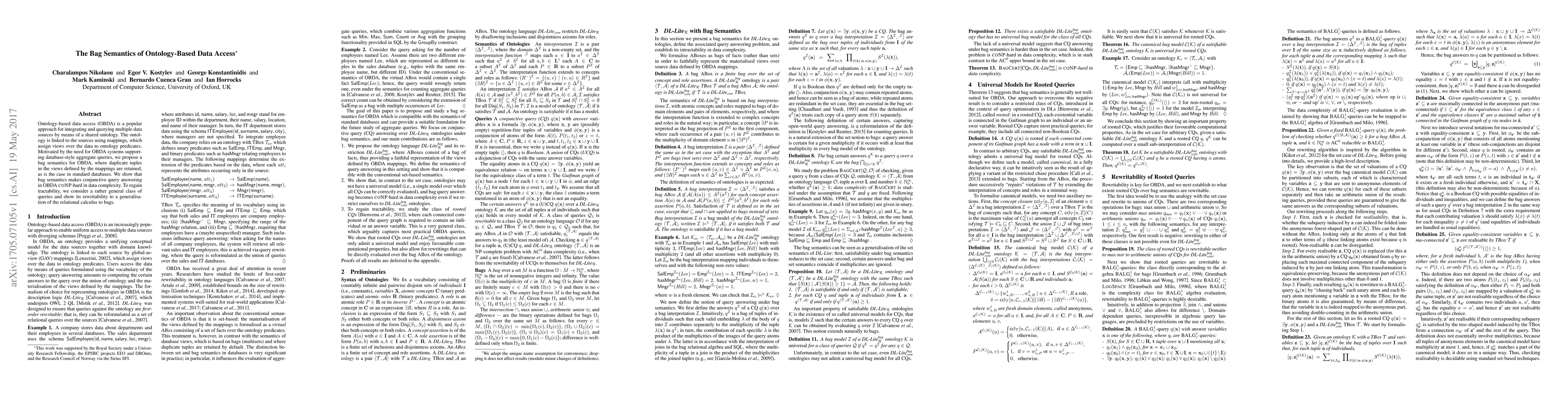 Title: The Bag Semantics of Ontology-Based Data Access Summary: This paper introduces a bag semantics for ontology-based data access (OBDA) systems to support aggregate queries, demonstrating that conjunctive query answering becomes coNP-hard under this approach, and proposes a rewritable query class for maintaining tractability.