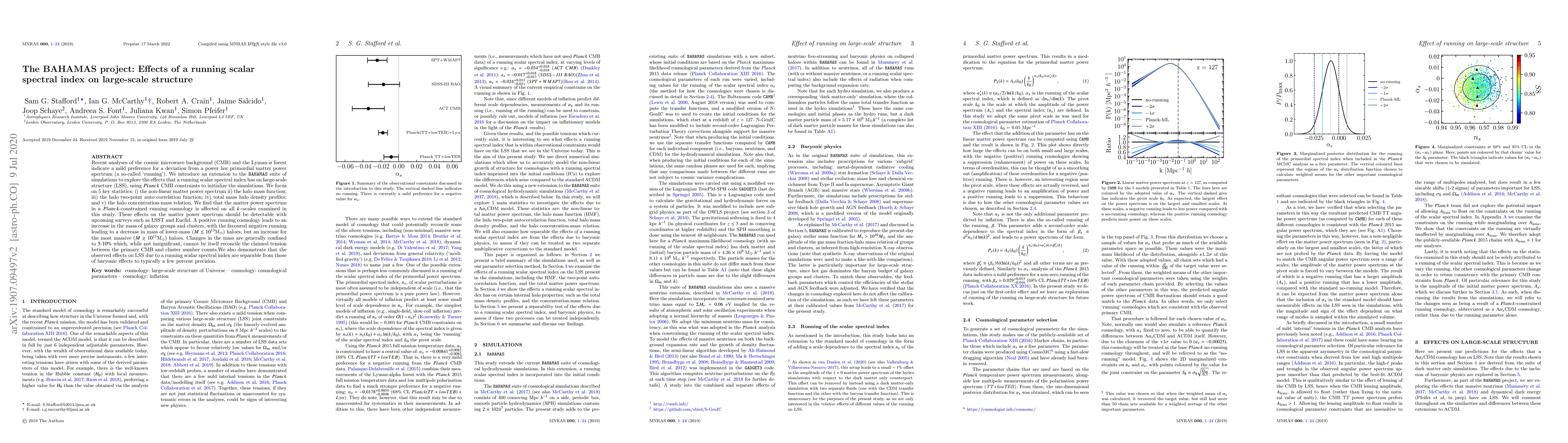 The BAHAMAS project investigates the impact of a running scalar spectral index on large-scale structure, revealing that it affects the matter power spectrum, alters halo mass functions, and modifies the mass of galaxy groups and clusters, though these changes are within 5-10% and do not resolve tensions between CMB and cluster counts. The running scalar spectral index also influences the concentration-mass relation of halos.