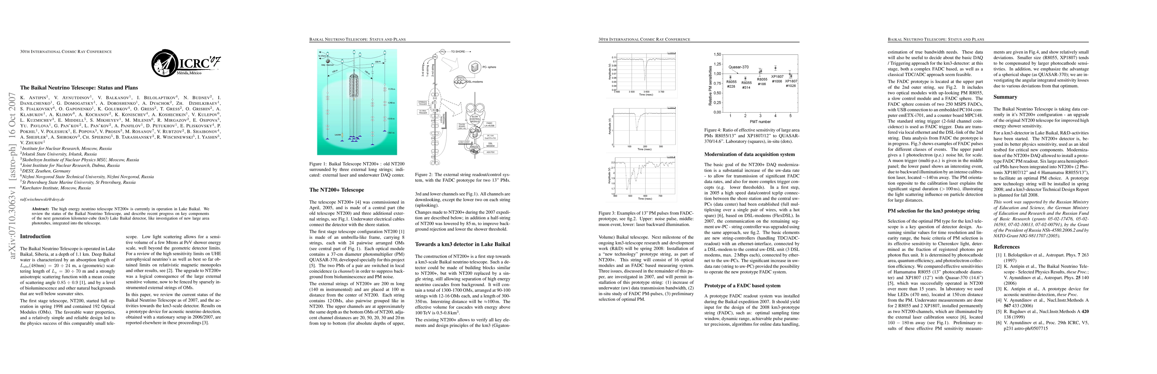 The Baikal Neutrino Telescope NT200+ is operational in Lake Baikal, focusing on high-energy neutrino detection. Recent advancements include the investigation of new large-area phototubes for the next-generation kilometer-cube detector.
