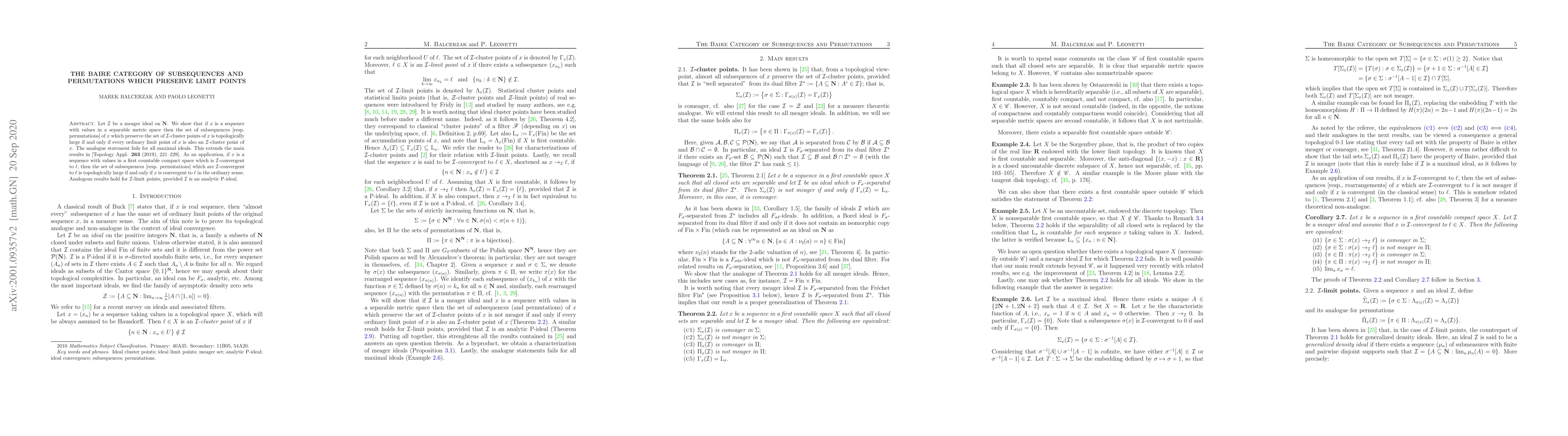 The paper provides detailed characterizations and proofs regarding the topological largeness of subsequences and permutations that preserve limit points under various ideals, extending previous work in the field.