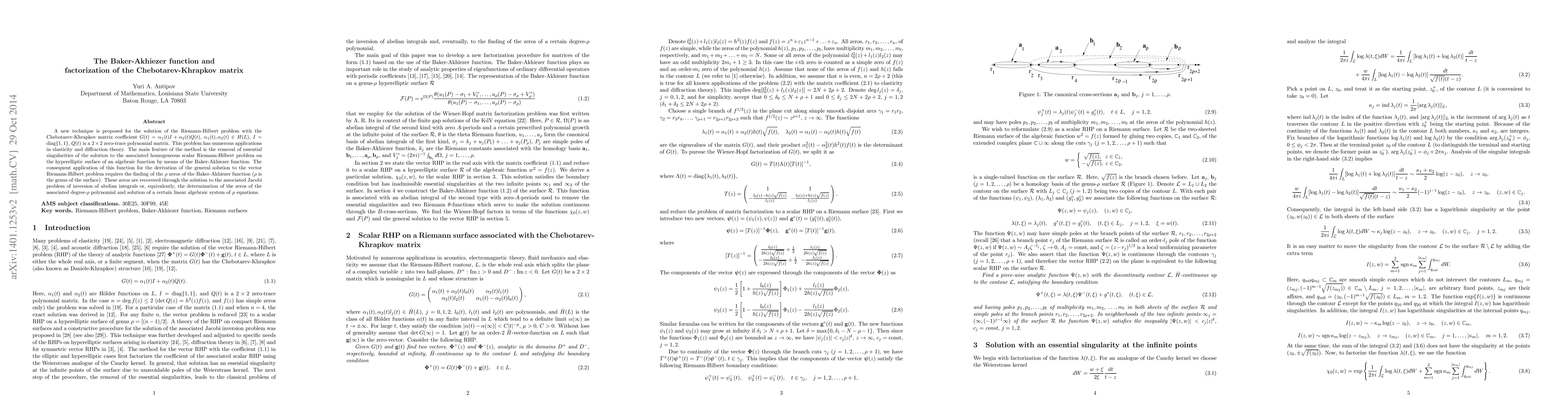 This paper introduces a novel method for solving the Riemann-Hilbert problem using the Baker-Akhiezer function to factorize the Chebotarev-Khrapkov matrix, which is crucial for applications in elasticity and diffraction theory. The method involves finding the zeros of the Baker-Akhiezer function to derive the general solution, achieved through solving the associated Jacobi problem.