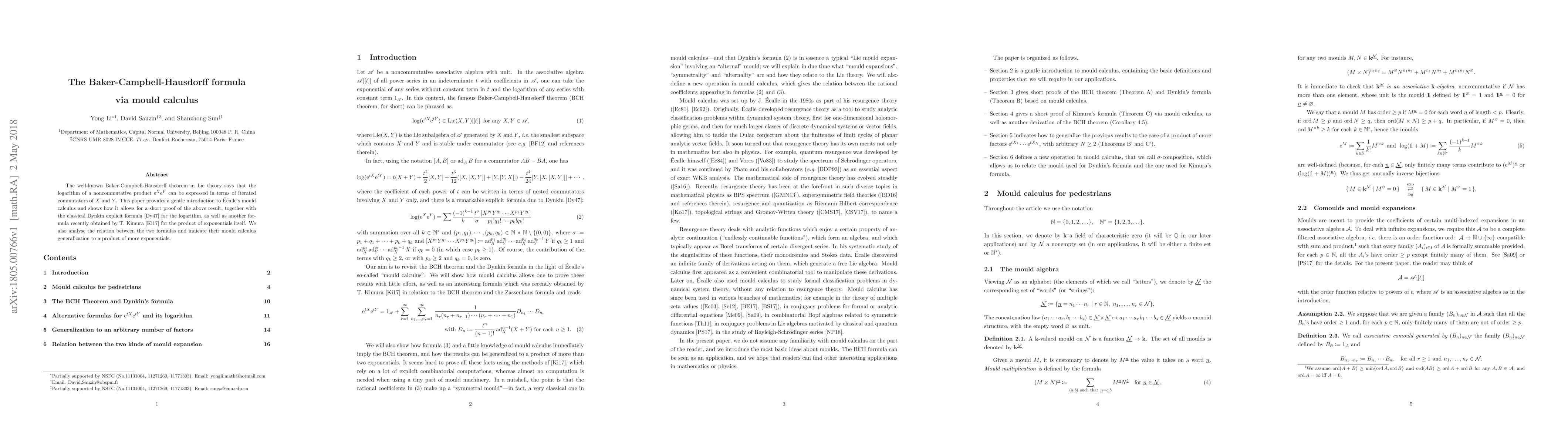 The well-known Baker-Campbell-Hausdorff theorem in Lie theory says that the logarithm of a noncommutative product e X e Y can be expressed in terms of iterated commutators of X and Y. This paper provides a gentle introduction t{\'o} Ecalle's mould calculus and shows how it allows for a short proof of the above result, together with the classical Dynkin explicit formula [Dy47] for the logarithm, as well as another formula recently obtained by T. Kimura [Ki17] for the product of exponentials itself. We also analyse the relation between the two formulas and indicate their mould calculus generalization to a product of more exponentials.