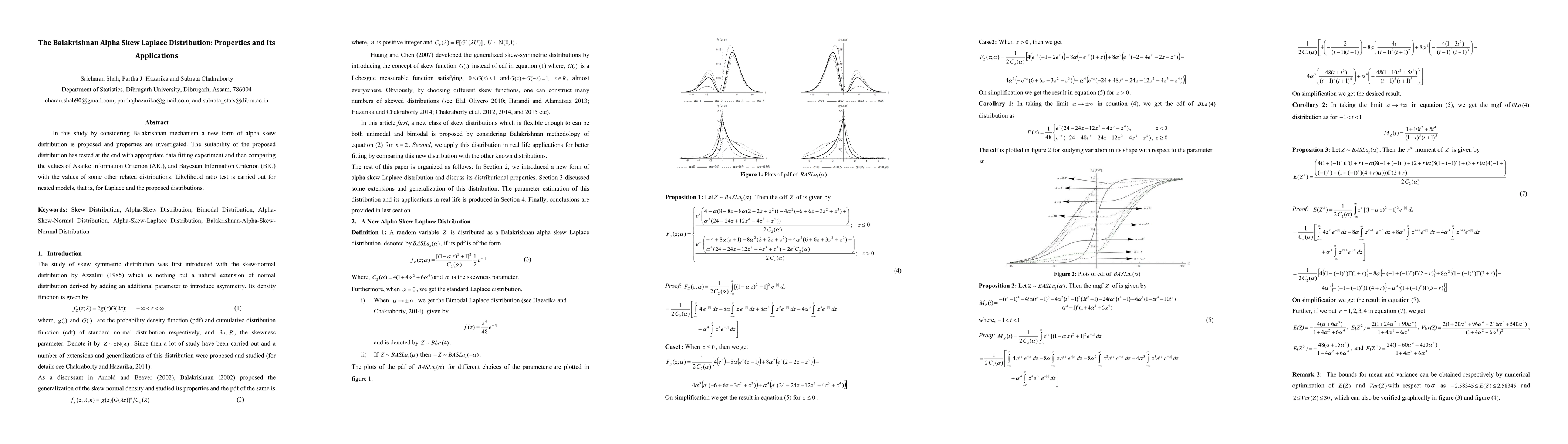 In this study by considering Balakrishnan mechanism a new form of alpha skew distribution is proposed and properties are investigated. The suitability of the proposed distribution has tested at the end with appropriate data fitting experiment and then comparing the values of Akaike Information Criterion (AIC), and Bayesian Information Criterion (BIC) with the values of some other related distributions. Likelihood ratio test is carried out for nested models, that is, for Laplace and the proposed distributions. Keywords: Skew Distribution, Alpha-Skew Distribution, Bimodal Distribution, Alpha-Skew-Normal Distribution, Alpha-Skew-Laplace Distribution, Balakrishnan-Alpha-Skew-Normal Distribution