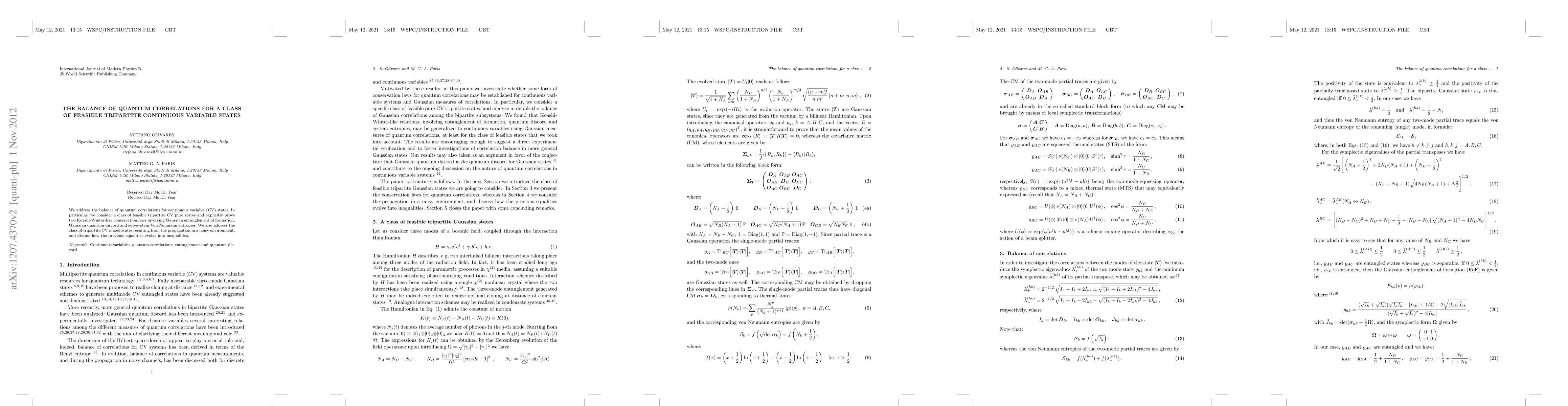 We address the balance of quantum correlations for continuous variable (CV) states. In particular, we consider a class of feasible tripartite CV pure states and explicitly prove two Koashi-Winter-like conservation laws involving Gaussian entanglement of formation, Gaussian quantum discord and sub-system Von Neumann entropies. We also address the class of tripartite CV mixed states resulting from the propagation in a noisy environment, and discuss how the previous equalities evolve into inequalities.