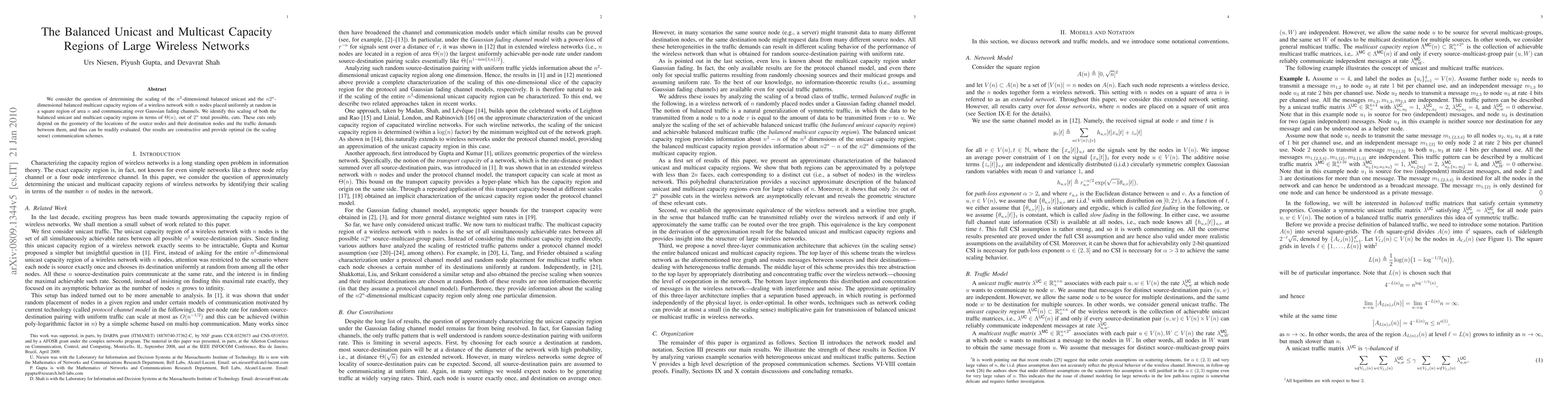 This paper determines the scaling of balanced unicast and multicast capacity regions in large wireless networks with randomly distributed nodes, identifying $\Theta(n)$ optimal cuts based on node geometry and traffic demands, and providing constructive optimal communication schemes.