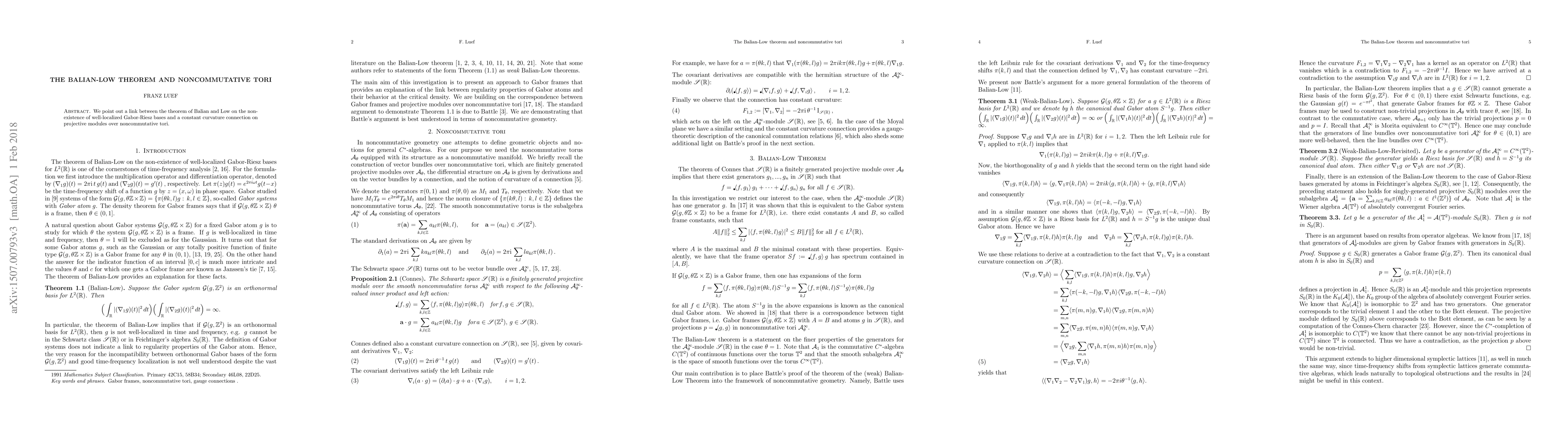 We point out a link between the theorem of Balian and Low on the non-existence of well-localized Gabor-Riesz bases and a constant curvature connection on projective modules over noncommutative tori.