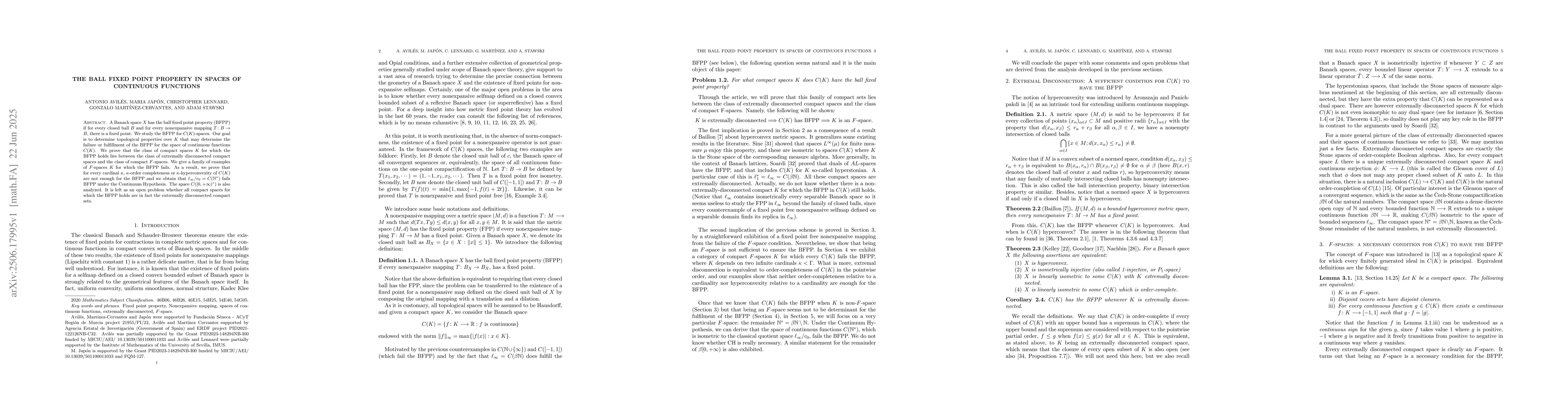 This research investigates the ball fixed point property (BFPP) in spaces of continuous functions C(K). It establishes that the class of compact spaces K with BFPP lies between extremally disconnected and F-spaces. The study provides examples where BFPP fails in F-spaces and proves that κ-order completeness or κ-hyperconvexity of C(K) isn't sufficient for BFPP. Under the Continuum Hypothesis, it's shown that ℓ_∞/c_0 = C(ℕ_*) fails BFPP. The paper leaves as an open problem whether all BFPP compact spaces are extremally disconnected.