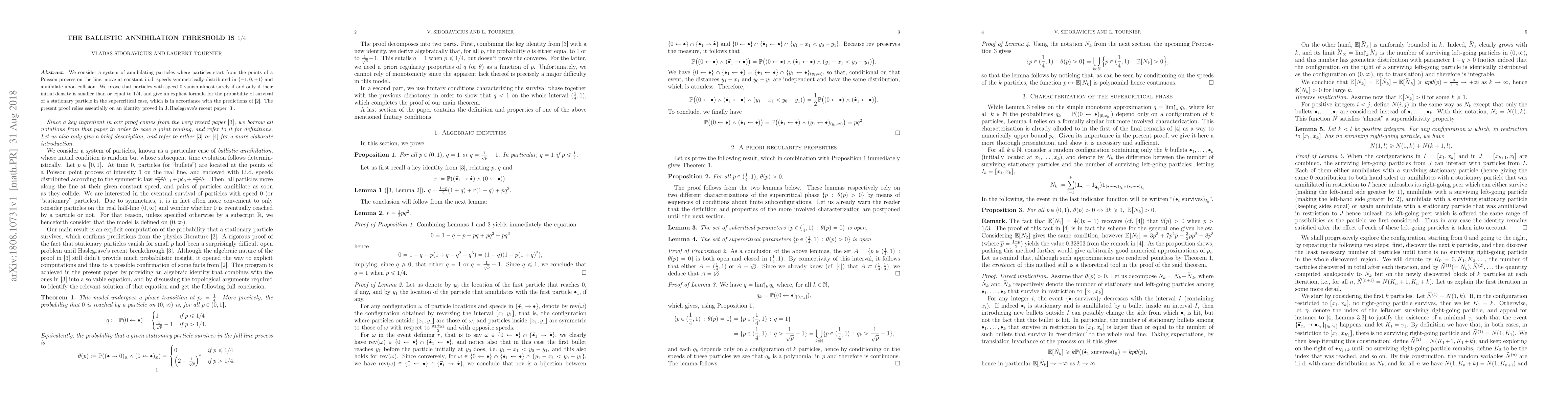 We consider a system of annihilating particles where particles start from the points of a Poisson process on the line, move at constant i.i.d. speeds symmetrically distributed in {-1,0,+1} and annihilate upon collision. We prove that particles with speed 0 vanish almost surely if and only if their initial density is smaller than or equal to 1/4, and give an explicit formula for the probability of survival of a stationary particle, which is in accordance with the predictions of [Droz et al. 1995]. The present proof relies essentially on an identity proved in a recent paper by J. Haslegrave.