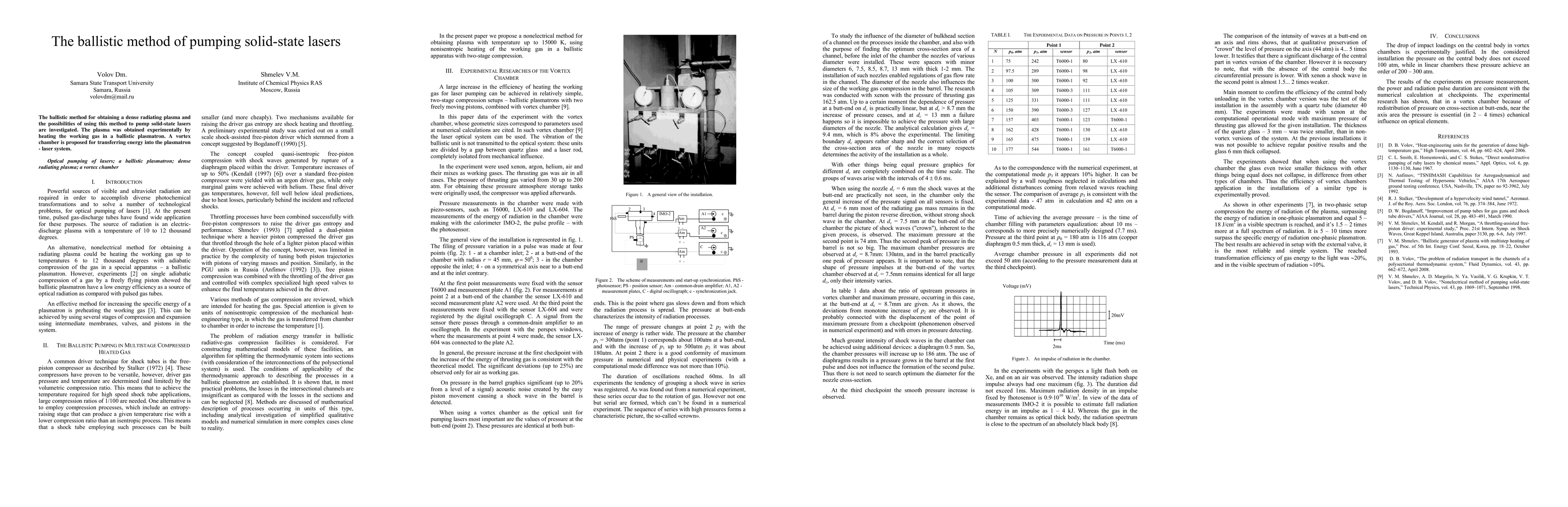 The ballistic method for obtaining a dense radiating plasma and the possibilities of using this method to pump solid-state lasers are investigated. The plasma was obtained experimentally by heating the working gas in a ballistic plasmatron. A vortex chamber is proposed for transferring energy into the plasmatron - laser system.