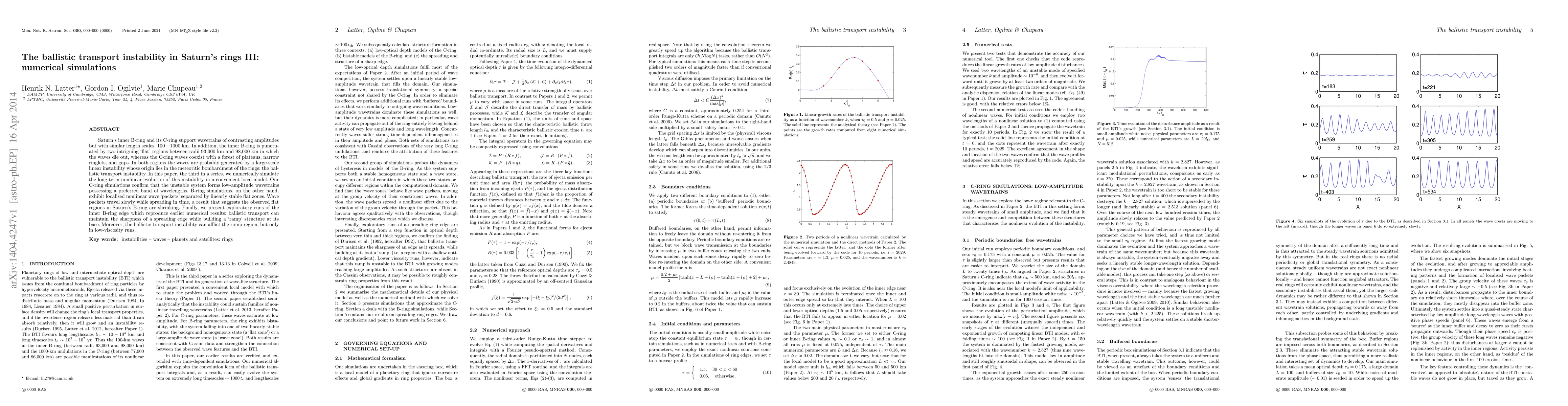 Saturn's inner B-ring and its C-ring support wavetrains of contrasting amplitudes but with similar length scales, 100-1000 km. In addition, the inner B-ring is punctuated by two intriguing `flat' regions between radii 93,000 km and 98,000 km in which the waves die out, whereas the C-ring waves coexist with a forest of plateaus, narrow ringlets, and gaps. In both regions the waves are probably generated by a large-scale linear instability whose origin lies in the meteoritic bombardment of the rings: the ballistic transport instability. In this paper, the third in a series, we numerically simulate the long-term nonlinear evolution of this instability in a convenient local model. Our C-ring simulations confirm that the unstable system forms low-amplitude wavetrains possessing a preferred band of wavelengths. B-ring simulations, on the other hand, exhibit localised nonlinear wave `packets' separated by linearly stable flat zones. Wave packets travel slowly while spreading in time, a result that suggests the observed flat regions in Saturn's B-ring are shrinking. Finally, we present exploratory runs of the inner B-ring edge which reproduce earlier numerical results: ballistic transport can maintain the sharpness of a spreading edge while building a `ramp' structure at its base. Moreover, the ballistic transport instability can afflict the ramp region, but only in low-viscosity runs.