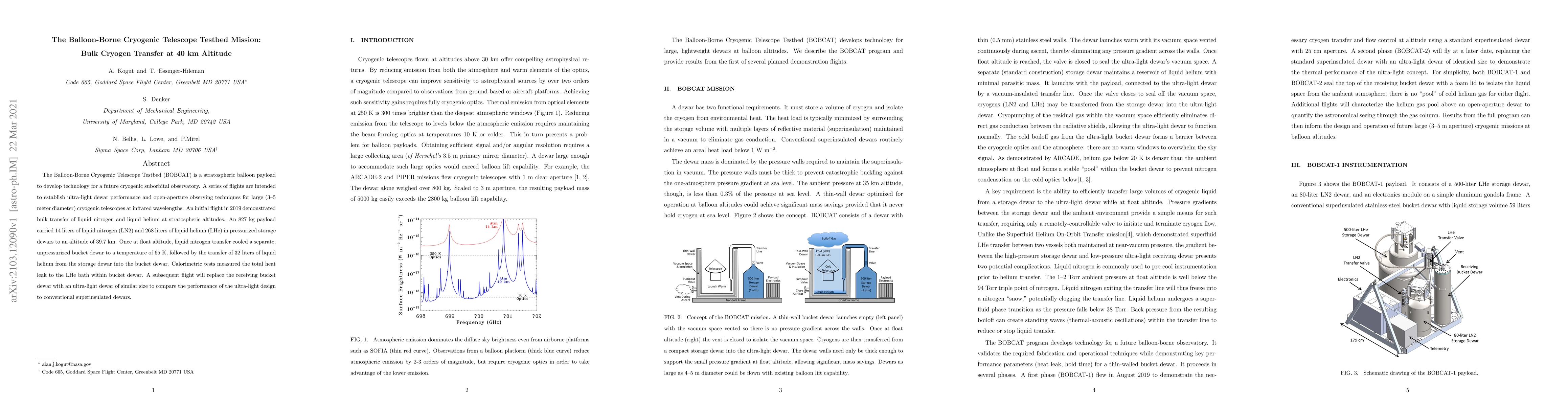 The Balloon-Borne Cryogenic Telescope Testbed (BOBCAT) is a stratospheric balloon payload to develop technology for a future cryogenic suborbital observatory. A series of flights are intended to establish ultra-light dewar performance and open-aperture observing techniques for large (3--5 meter diameter) cryogenic telescopes at infrared wavelengths. An initial flight in 2019 demonstrated bulk transfer of liquid nitrogen and liquid helium at stratospheric altitudes. An 827 kg payload carried 14 liters of liquid nitrogen (LN2) and 268 liters of liquid helium (LHe) in pressurized storage dewars to an altitude of 39.7 km. Once at float altitude, liquid nitrogen transfer cooled a separate, unpressurized bucket dewar to a temperature of 65 K, followed by the transfer of 32 liters of liquid helium from the storage dewar into the bucket dewar. Calorimetric tests measured the total heat leak to the LHe bath within bucket dewar. A subsequent flight will replace the receiving bucket dewar with an ultra-light dewar of similar size to compare the performance of the ultra-light design to conventional superinsulated dewars.