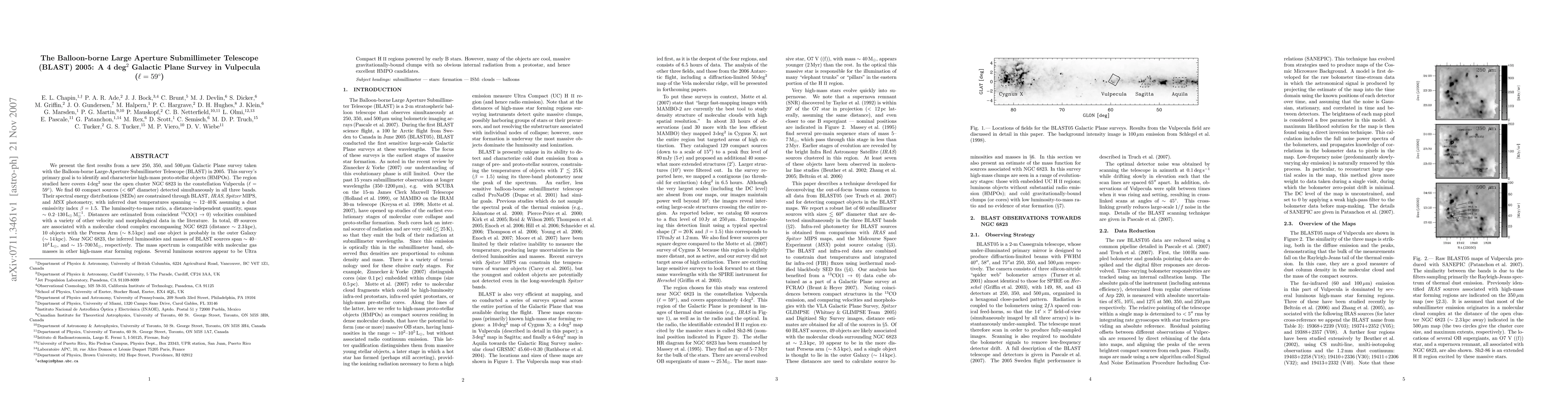 We present the first results from a new 250, 350, and 500 micron Galactic Plane survey taken with the Balloon-borne Large-Aperture Submillimeter Telescope (BLAST) in 2005. This survey's primary goal is to identify and characterize high-mass proto-stellar objects (HMPOs). The region studied here covers 4 sq. deg near the open cluster NGC 6823 in the constellation Vulpecula (l=59). We find 60 compact sources (<60'' diameter) detected simultaneously in all three bands. Their spectral energy distributions (SEDs) are constrained through BLAST, IRAS, Spitzer MIPS, and MSX photometry, with inferred dust temperatures spanning ~12-40K assuming a dust emissivity index beta=1.5. The luminosity-to-mass ratio, a distance-independent quantity, spans ~0.2-130 L_\odot M_\odot^{-1}. Distances are estimated from coincident 13CO (1->0) velocities combined with a variety of other velocity and morphological data in the literature. In total, 49 sources are associated with a molecular cloud complex encompassing NGC 6823 (distance ~2.3kpc), 10 objects with the Perseus Arm (~8.5kpc) and one object is probably in the outer Galaxy (~14kpc). Near NGC 6823, the inferred luminosities and masses of BLAST sources span ~40-10^4 L_\odot, and ~15-700 M_\odot, respectively. The mass spectrum is compatible with molecular gas masses in other high-mass star forming regions. Several luminous sources appear to be Ultra Compact HII regions powered by early B stars. However, many of the objects are cool, massive gravitationally-bound clumps with no obvious internal radiation from a protostar, and hence excellent HMPO candidates.