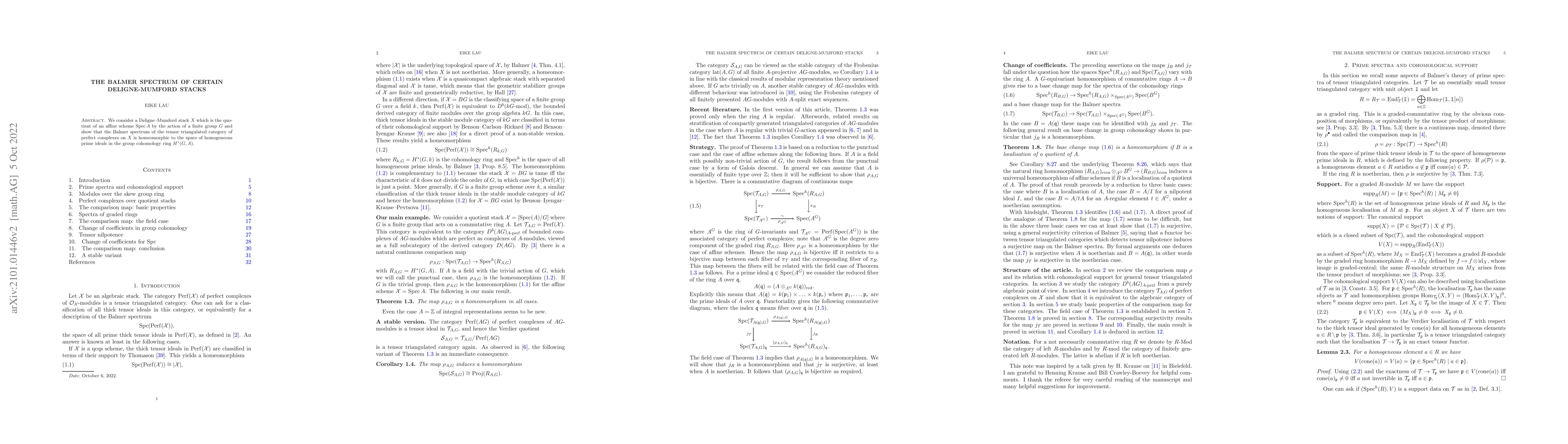 This paper demonstrates that the Balmer spectrum of the tensor triangulated category of perfect complexes on a Deligne-Mumford stack $X$ is homeomorphic to the space of homogeneous prime ideals in the group cohomology ring $H^*(G,A)$, where $X$ is the quotient of $\operatorname{Spec}A$ by a finite group $G$.