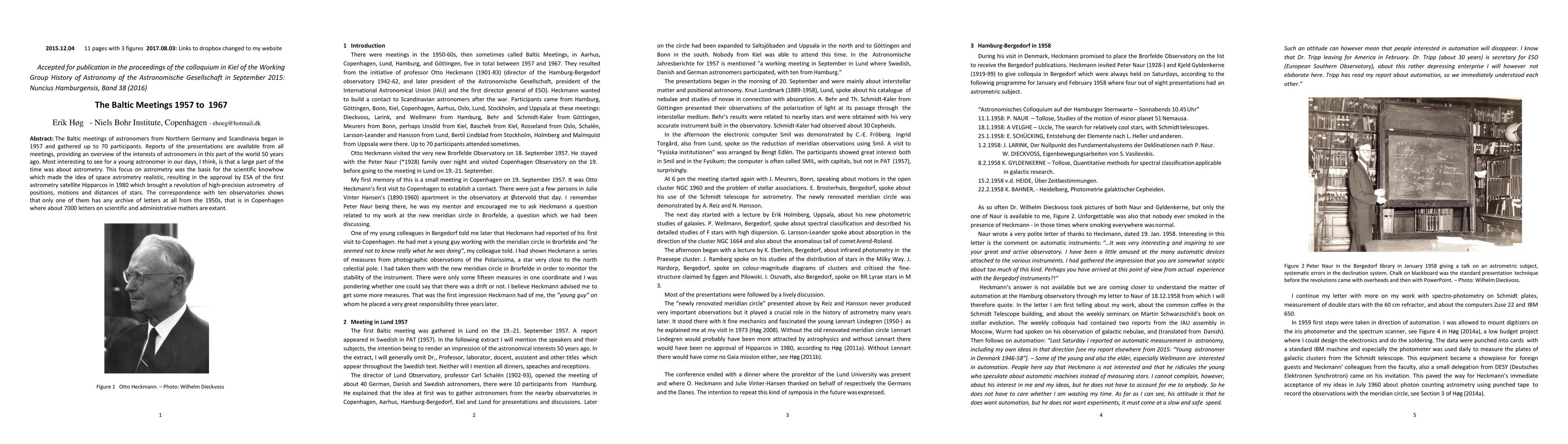 The Baltic meetings of astronomers from Northern Germany and Scandinavia began in 1957 and gathered up to 70 participants. Reports of the presentations are available from all meetings, providing an overview of the interests of astronomers in this part of the world 50 years ago. Most interesting to see for a young astronomer in our days, I think, is that a large part of the time was about astrometry. This focus on astrometry was the basis for the scientific knowhow which made the idea of space astrometry realistic, resulting in the approval by ESA of the first astrometry satellite Hipparcos in 1980 which brought a revolution of high-precision astrometry of positions, motions and distances of stars. The correspondence with ten observatories shows that only one of them has any archive of letters at all from the 1950s, that is in Copenhagen where about 7000 letters on scientific and administrative matters are extant. - These letters have now been stored in the Rigsarkivet.