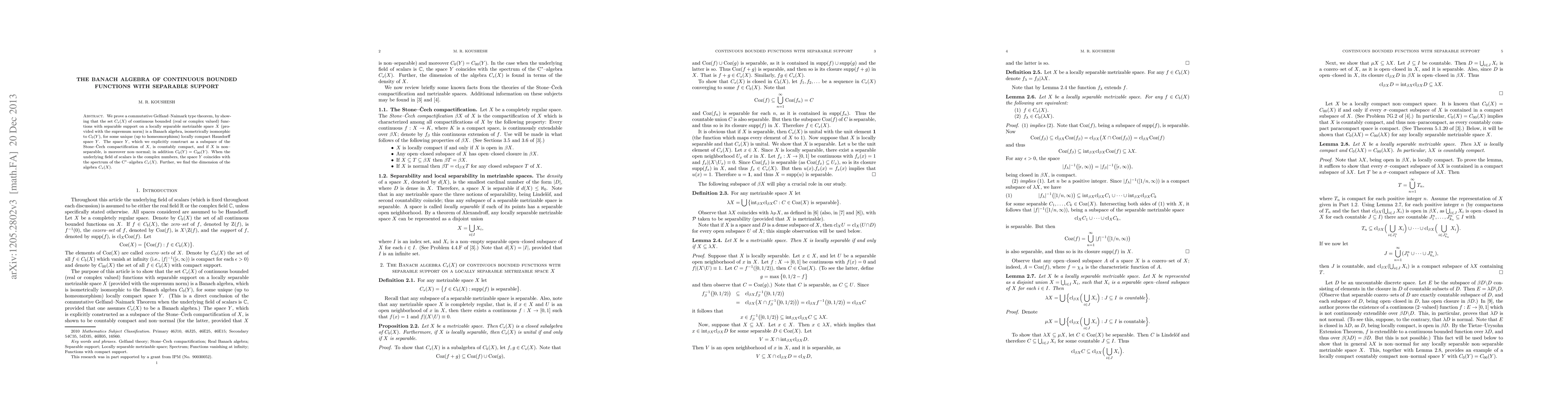We prove a commutative Gelfand--Naimark type theorem, by showing that the set $C_s(X)$ of continuous bounded (real or complex valued) functions with separable support on a locally separable metrizable space $X$ (provided with the supremum norm) is a Banach algebra, isometrically isomorphic to $C_0(Y)$, for some unique (up to homeomorphism) locally compact Hausdorff space $Y$. The space $Y$, which we explicitly construct as a subspace of the Stone--\v{C}ech compactification of $X$, is countably compact, and if $X$ is non-separable, is moreover non-normal; in addition $C_0(Y)=C_{00}(Y)$. When the underlying field of scalars is the complex numbers, the space $Y$ coincides with the spectrum of the ${C}^*$-algebra $C_s(X)$. Further, we find the dimension of the algebra $C_s(X)$.