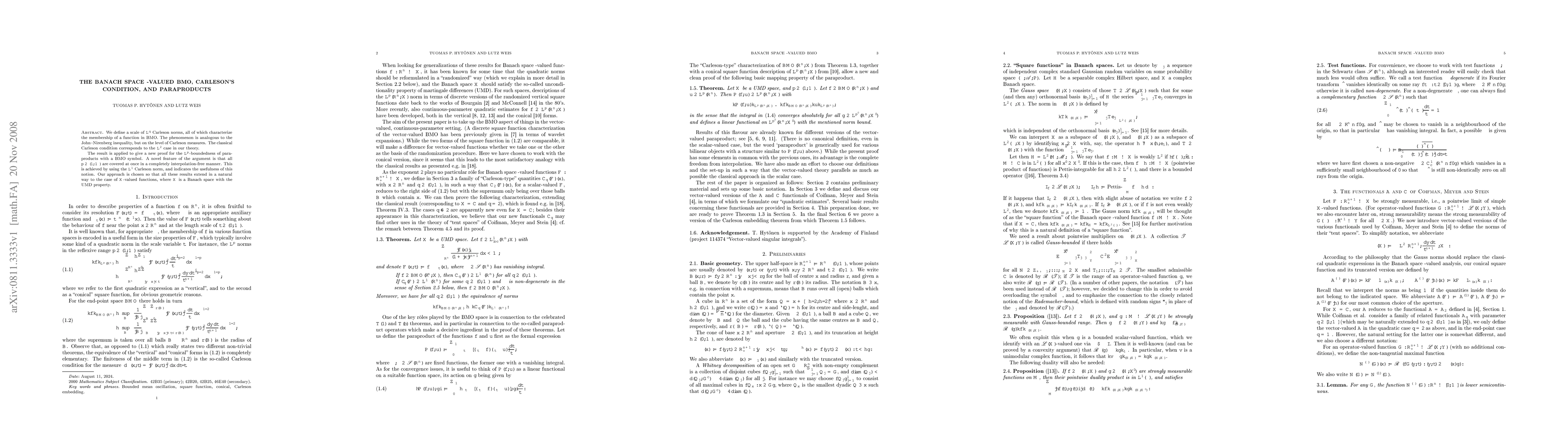 This paper defines a scale of L^q Carleson norms characterizing BMO membership and applies it to prove the L^p-boundedness of paraproducts with a BMO symbol, covering all p simultaneously without interpolation. The approach extends naturally to Banach space-valued functions with the UMD property.