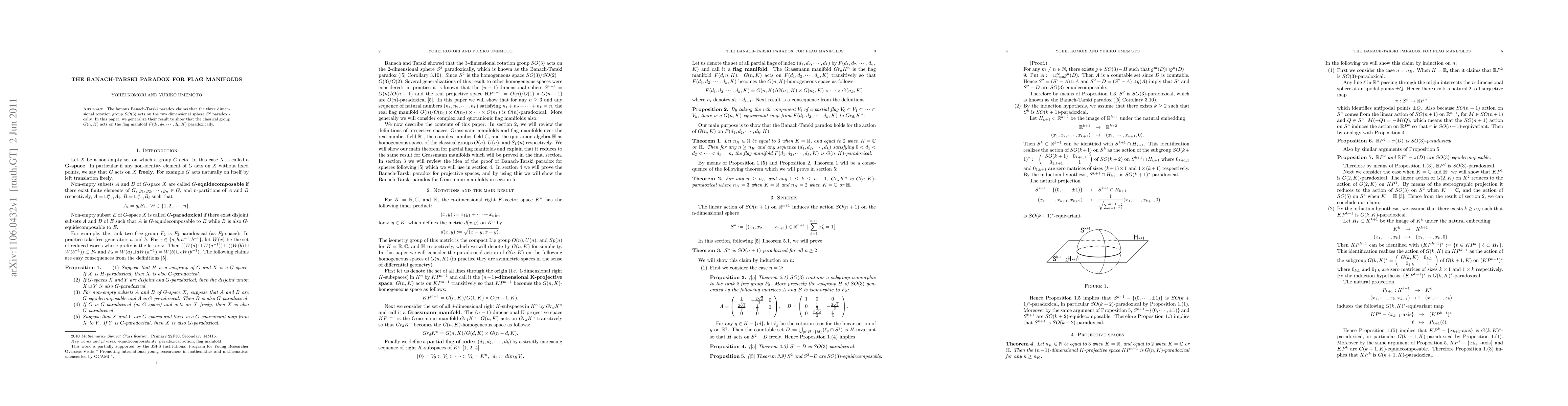 Summary: This paper extends the Banach-Tarski paradox from the three-dimensional sphere to flag manifolds, demonstrating that the classical group can act paradoxically on these higher-dimensional geometric structures.