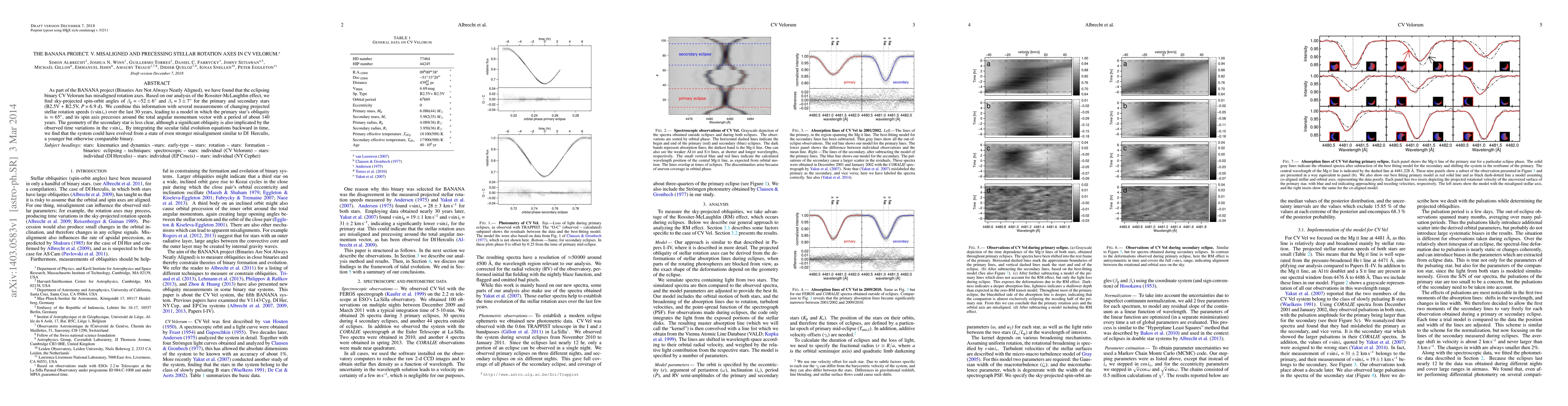 As part of the BANANA project (Binaries Are Not Always Neatly Aligned), we have found that the eclipsing binary CV Velorum has misaligned rotation axes. Based on our analysis of the Rossiter-McLaughlin effect, we find sky-projected spin-orbit angles of $\beta_{\rm p} = -52\pm6^{\circ}$ and $\beta_{\rm s}= 3\pm7^{\circ}$ for the primary and secondary stars (B2.5V $+$ B2.5V, $P=6.9$ d). We combine this information with several measurements of changing projected stellar rotation speeds ($v \sin i_{\star}$) over the last $30$ years, leading to a model in which the primary star's obliquity is $\approx65^{\circ}$, and its spin axis precesses around the total angular momentum vector with a period of about $140$ years. The geometry of the secondary star is less clear, although a significant obliquity is also implicated by the observed time variations in the $v \sin i_{\star}$. By integrating the secular tidal evolution equations backward in time, we find that the system could have evolved from a state of even stronger misalignment similar to DI Herculis, a younger but otherwise comparable binary.