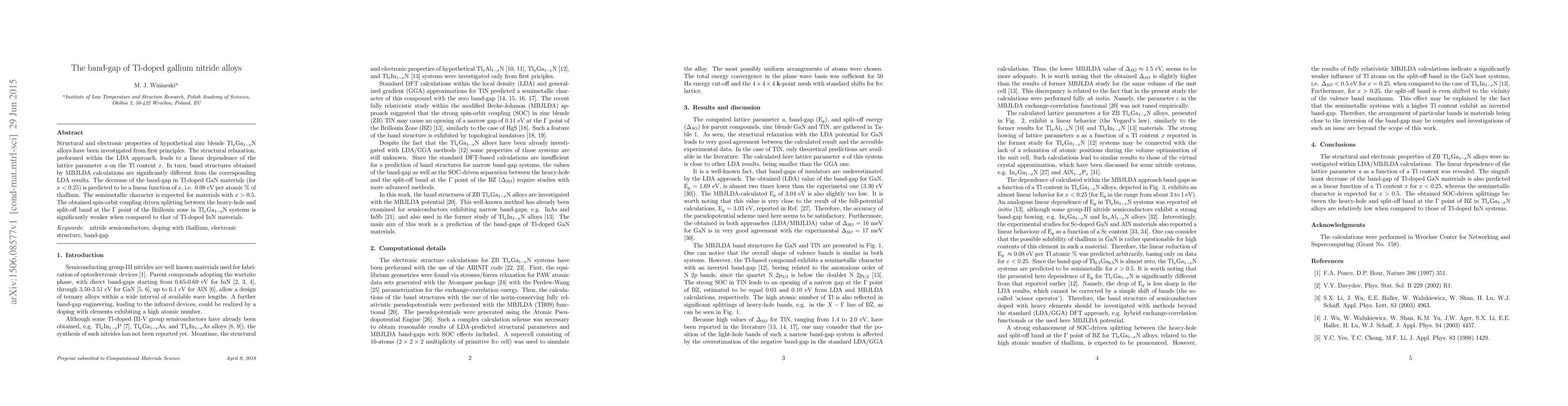 Structural and electronic properties of hypothetical zinc blende Tl(x)Ga(1-x)N alloys have been investigated from first principles. The structural relaxation, preformed within the LDA approach, leads to a linear dependence of the lattice parameter a on the Tl content x. In turn, band structures obtained by MBJLDA calculations are significantly different from the corresponding LDA results. The decrease of the band-gap in Tl-doped GaN materials (for x<0.25) is predicted to be a linear function of x, i.e. 0.08 eV per atomic % of thallium. The semimetallic character is expected for materials with x>0.5. The obtained spin-orbit coupling driven splitting between the heavy-hole and split-off band at the Gamma point of the Brillouin zone in Tl(x)Ga(1-x)N systems is significantly weaker when compared to that of Tl-doped InN materials.