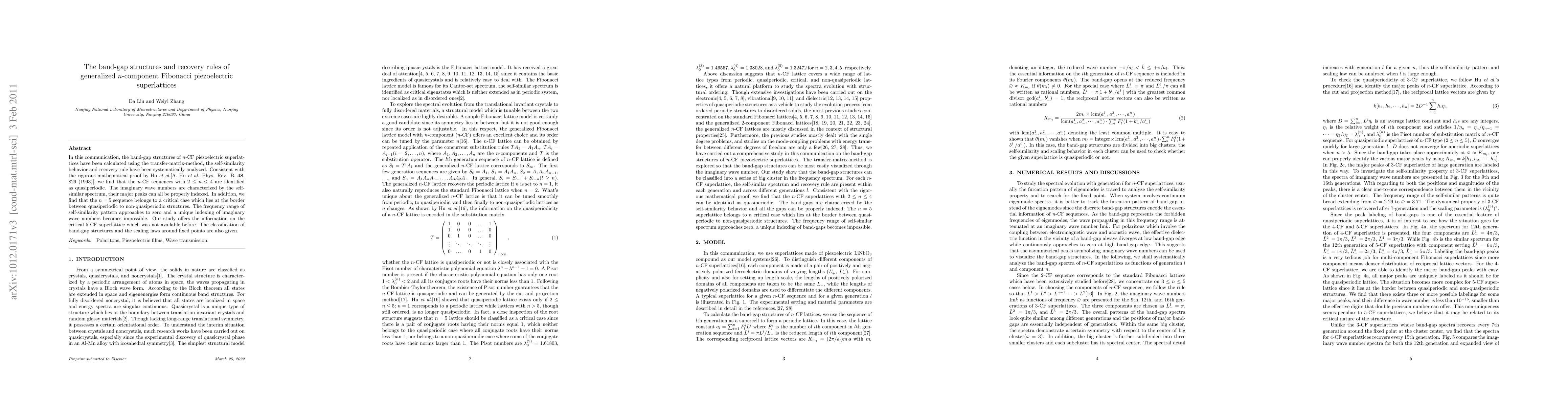 The spectral evolution from periodic structure to random structure has always been an interesting topic in solid state physics, the generalized n-component Fibonacci sequences (n- CF) provide a convenient tool to investigate such process since its randomness can be controlled via the parameter n. In this letter, the band-gap structures of n-CF piezoelectric superlattices have been calculated using the transfer-matrix-method, the self-similarity behavior and recovery rule have been systematically analyzed. Consistent with the rigorous mathematical proof by Hu et al.[A. Hu et al. Phys. Rev. B. 48, 829 (1993)], we find that the n-CF sequences with 2 \leq n \leq 4 are identified as quasiperiodic. The imaginary wave numbers are characterized by the self-similar spectrum, their major peaks can all be properly indexed. In addition, we find that the n = 5 sequence belongs to a critical case which lies at the border between quasiperiodic to aperiodic structures. The frequency range of self-similarity pattern approaches to zero and a unique indexing of imaginary wave numbers becomes impossible. Our study offers the information on the critical 5-CF superlattice which was not available before. The classification of band-gap structures and the scaling laws around fixed points are also given.