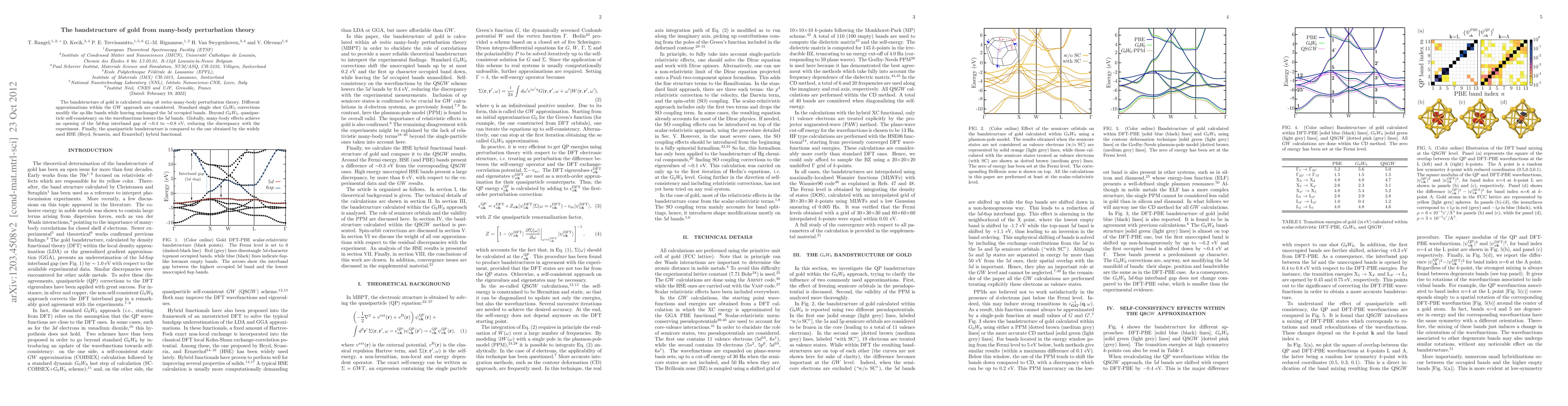 This research calculates gold's bandstructure using many-body perturbation theory (MBPT), particularly the GW approach. It finds that while single-shot G0W0 corrections adjust the bands, quasiparticle self-consistency further refines the 5d bands, achieving an interband gap that aligns closely with experimental data, unlike the HSE hybrid functional.