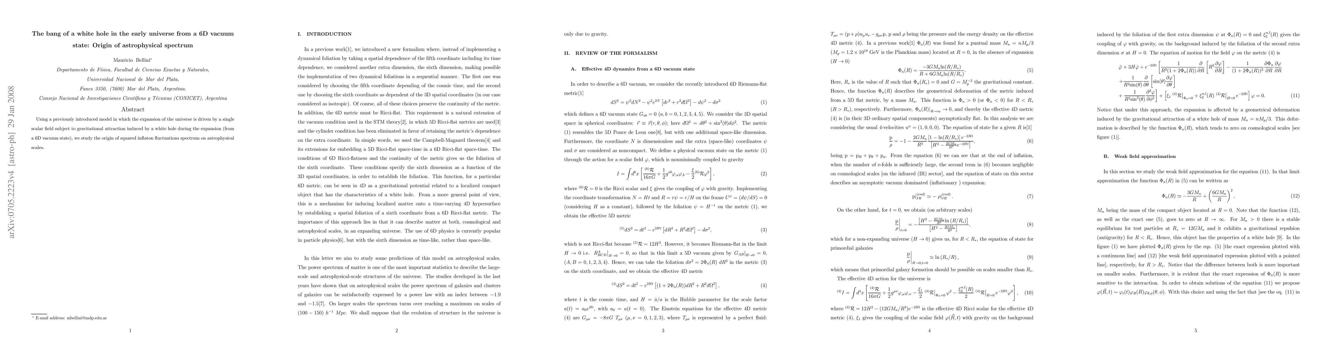 Using a previously introduced model in which the expansion of the universe is driven by a single scalar field subject to gravitational attraction induced by a white hole during the expansion (from a 6D vacuum state), we study the origin of squared inflaton fluctuations spectrum on astrophysical scales.