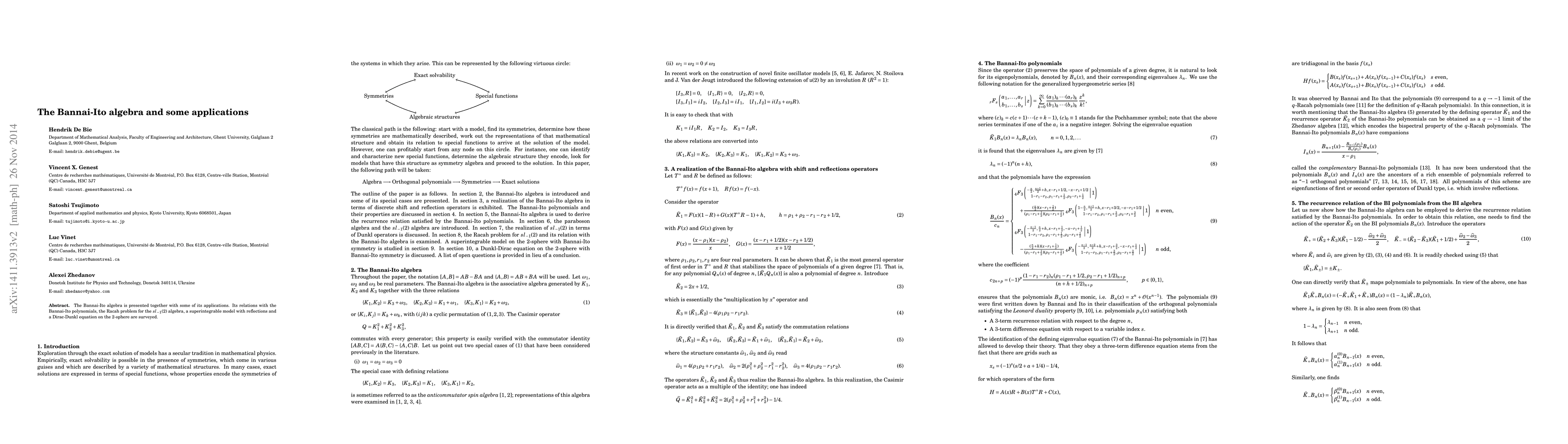 Summary: This paper introduces the Bannai-Ito algebra and explores its connections to Bannai-Ito polynomials, the Racah problem, a superintegrable model, and the Dirac-Dunkl equation on the 2-sphere, highlighting its diverse applications.