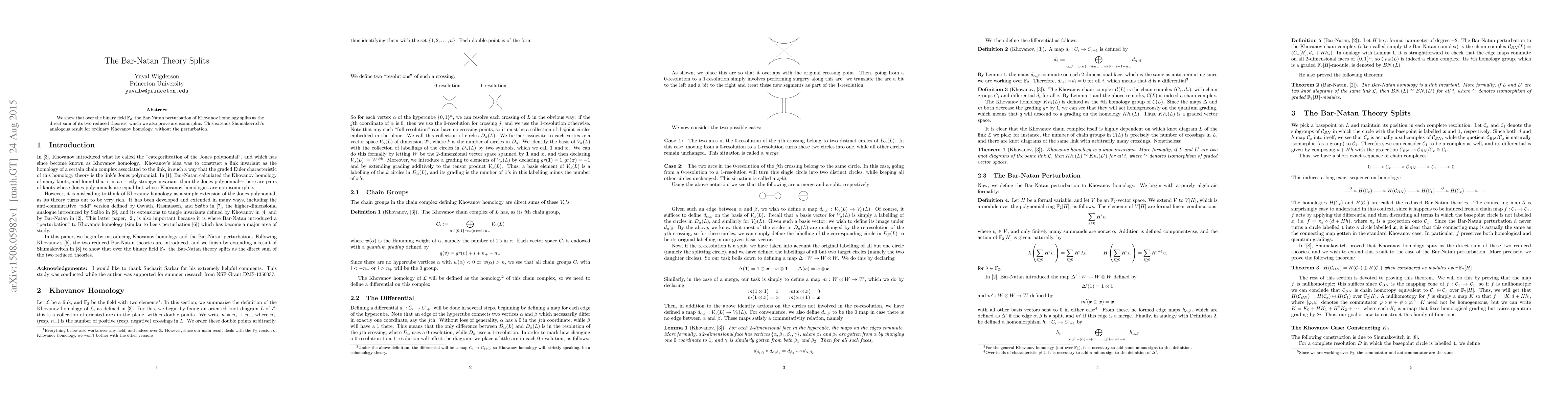 The paper presents a detailed proof of the splitting of Bar-Natan theory into isomorphic reduced theories over $\mathbb F_2$, introducing new homotopies $K_i$ for all $i > 0$ and proving their chain map properties.