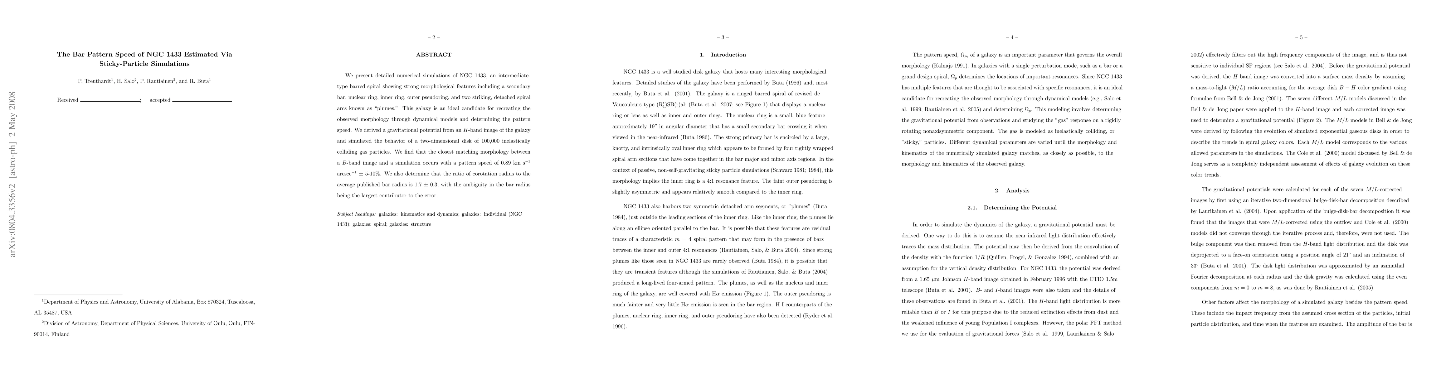 Researchers simulated NGC 1433 galaxy using sticky-particle simulations to estimate pattern speed of 0.89 km s$^{-1}$ arcsec$^{-1}$, finding a good match between simulation and B-band image.